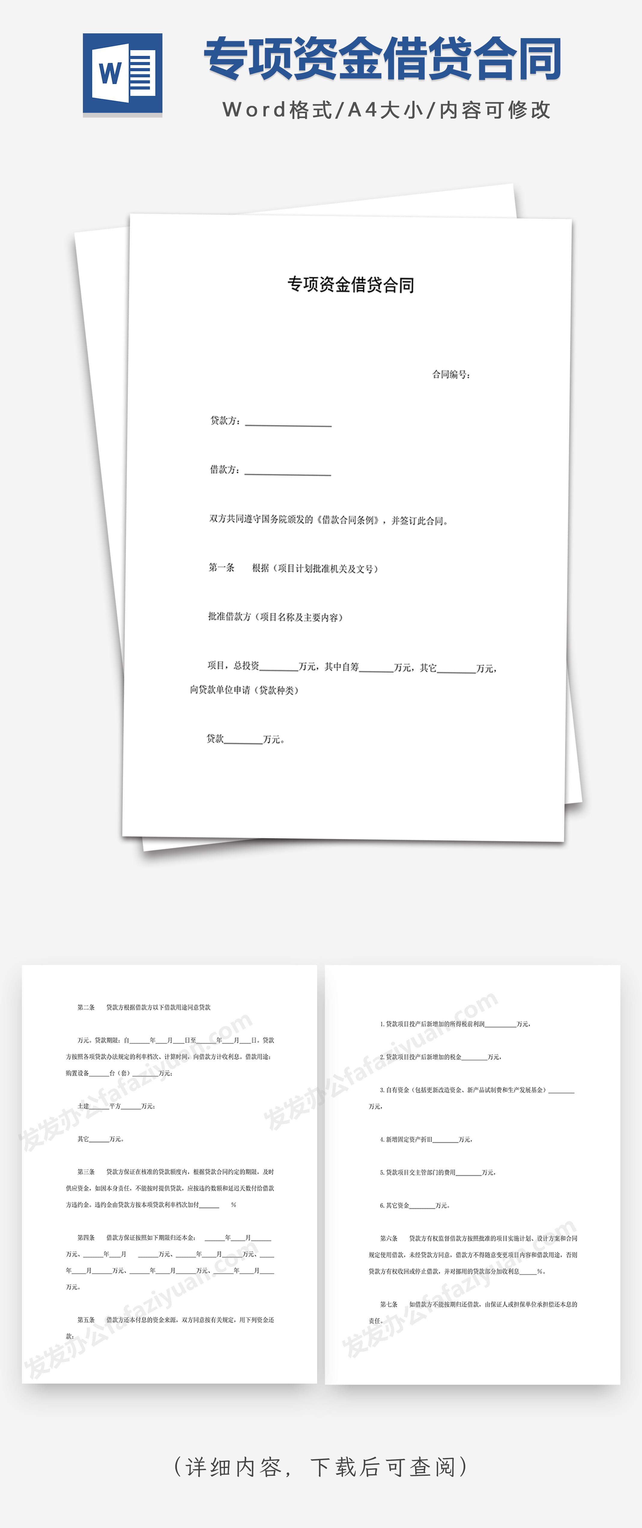 本作品内容为专项资金借贷合同, 格式为 docx, 大小1 MB, 页数为4, 请使用软件Word打开, 作品中主体文字及图片可替换修改,文字修改可直接点击文本框进行编辑,图片更改可选中图片后单击鼠标右键选择更换图片,也可根据自身需求增加和删除作品中的内容, 源文件无水印, 欢迎使用发发资源库。