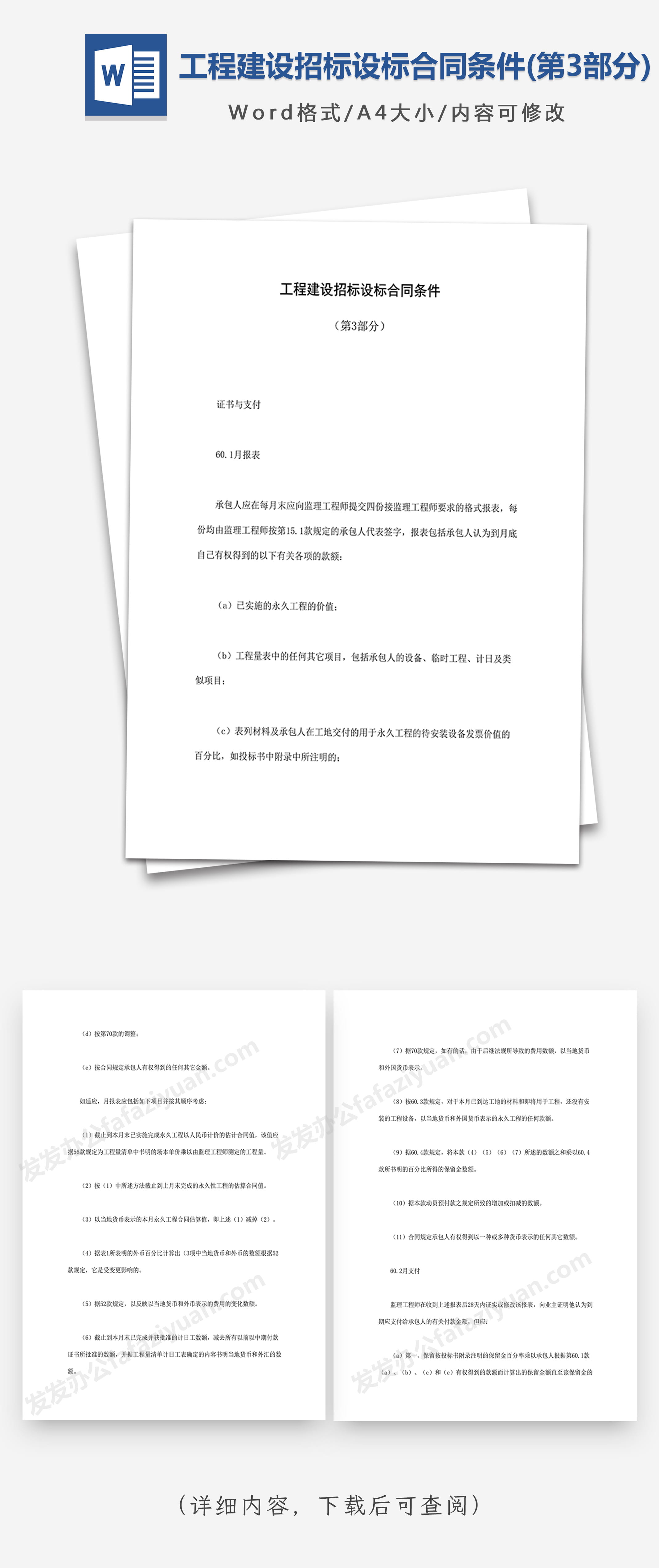 本作品内容为工程建设招标设标合同条件(第3部分), 格式为 docx, 大小1 MB, 页数为40, 请使用软件Word打开, 作品中主体文字及图片可替换修改,文字修改可直接点击文本框进行编辑,图片更改可选中图片后单击鼠标右键选择更换图片,也可根据自身需求增加和删除作品中的内容, 源文件无水印, 欢迎使用发发资源库。