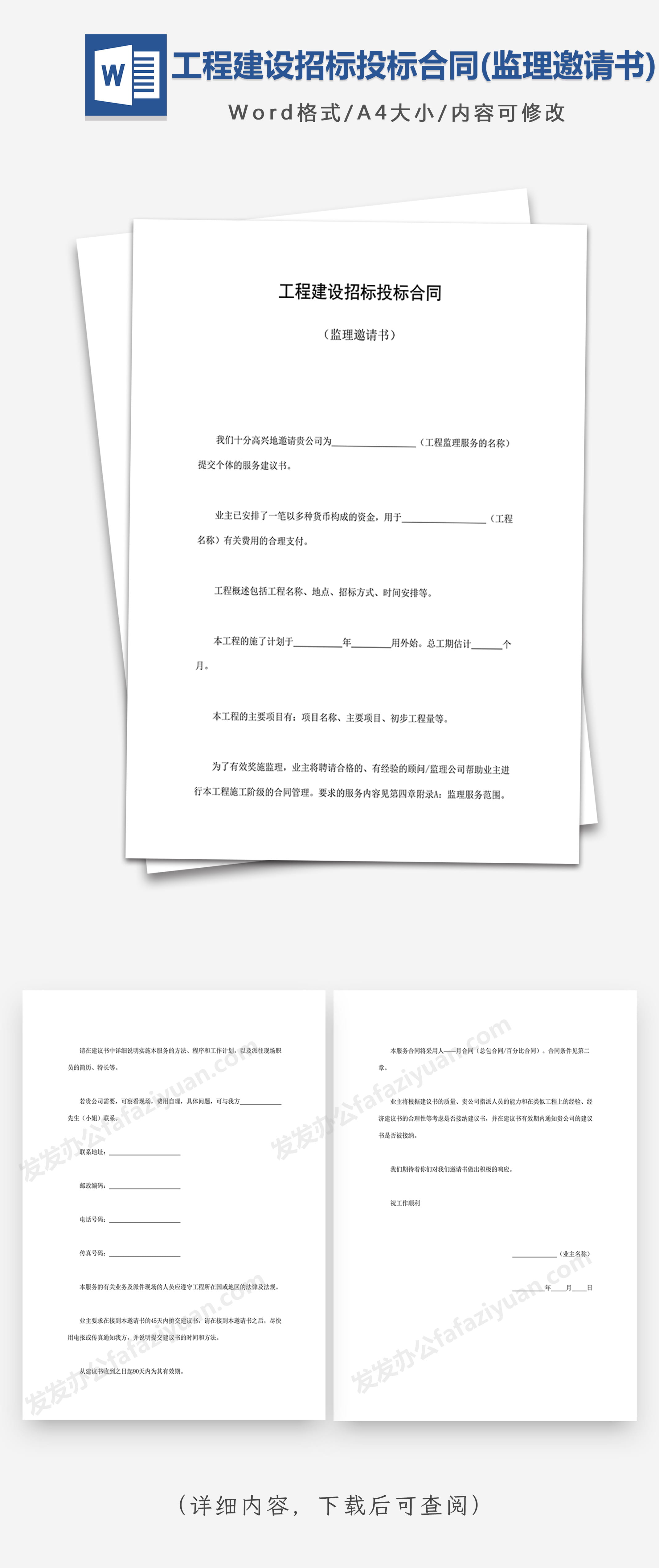 本作品内容为工程建设招标投标合同(监理邀请书), 格式为 docx, 大小1 MB, 页数为3, 请使用软件Word打开, 作品中主体文字及图片可替换修改,文字修改可直接点击文本框进行编辑,图片更改可选中图片后单击鼠标右键选择更换图片,也可根据自身需求增加和删除作品中的内容, 源文件无水印, 欢迎使用发发资源库。 资源下载此资源下载价格为8.8F币,VIP免费,请先登录