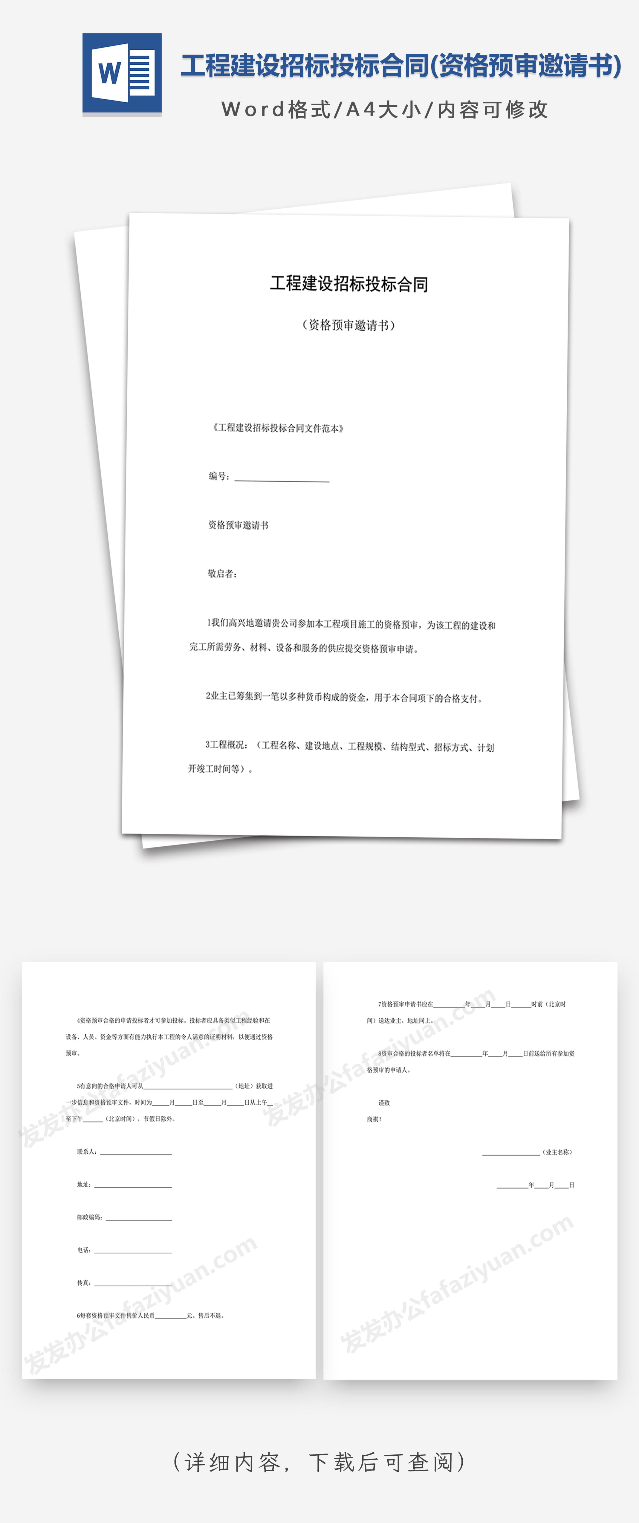本作品内容为工程建设招标投标合同(资格预审邀请书), 格式为 docx, 大小1 MB, 页数为3, 请使用软件Word打开, 作品中主体文字及图片可替换修改,文字修改可直接点击文本框进行编辑,图片更改可选中图片后单击鼠标右键选择更换图片,也可根据自身需求增加和删除作品中的内容, 源文件无水印, 欢迎使用发发资源库。