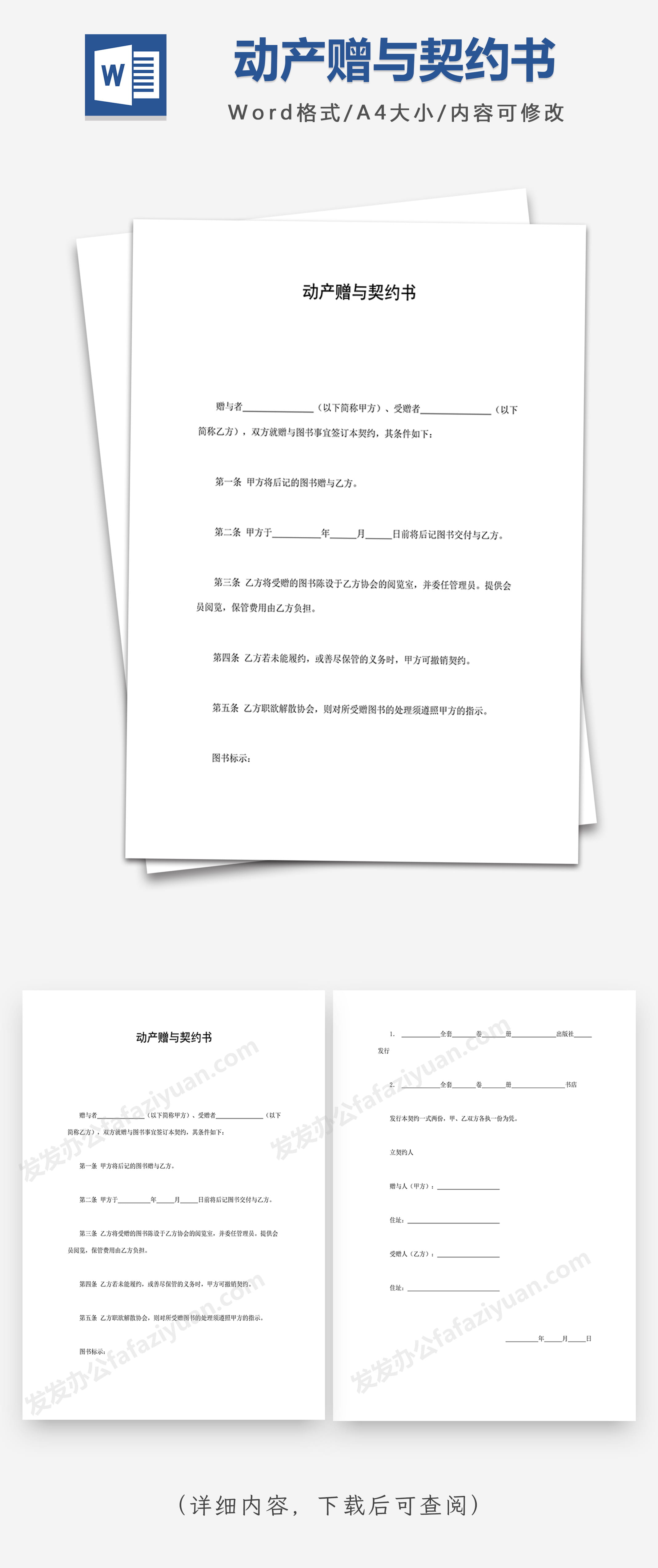 本作品内容为动产赠与契约书, 格式为 docx, 大小1 MB, 页数为2, 请使用软件Word打开, 作品中主体文字及图片可替换修改,文字修改可直接点击文本框进行编辑,图片更改可选中图片后单击鼠标右键选择更换图片,也可根据自身需求增加和删除作品中的内容, 源文件无水印, 欢迎使用发发资源库。 资源下载此资源下载价格为8.8F币,VIP免费,请先登录