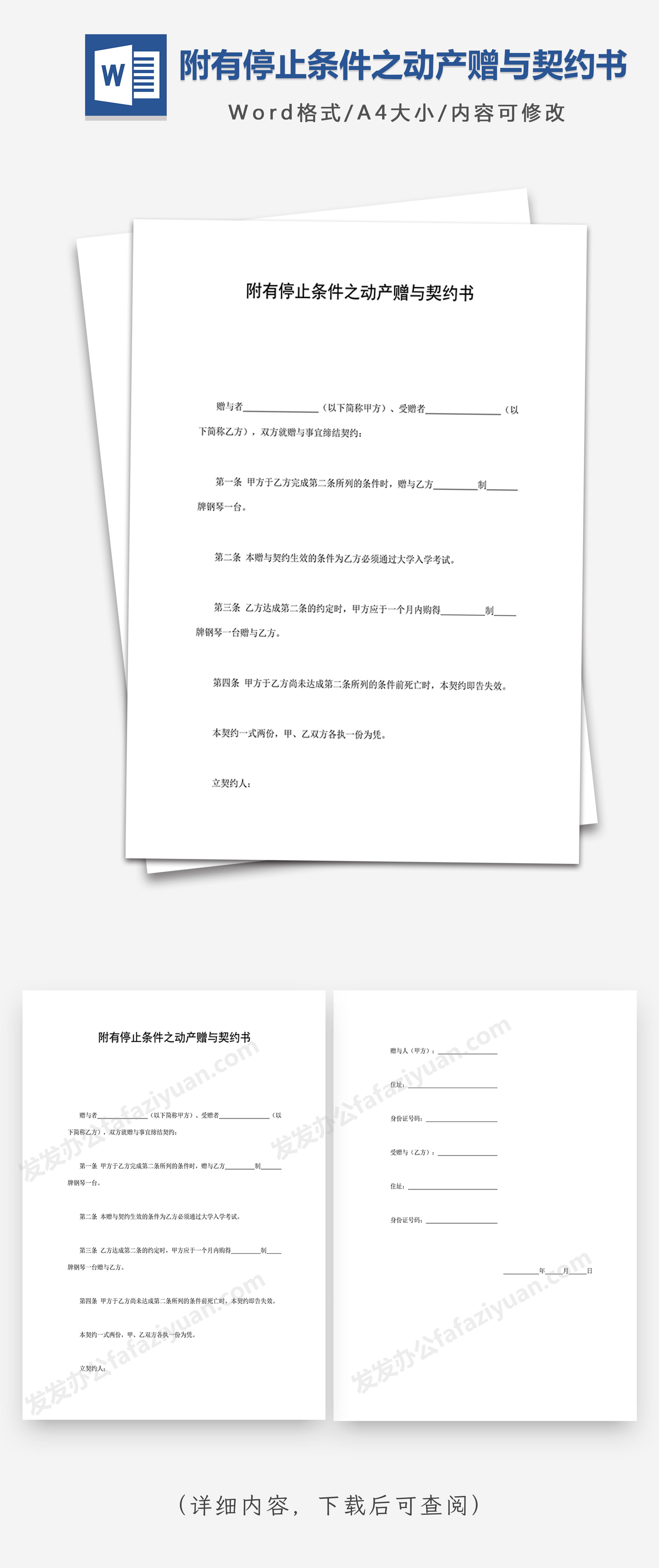 本作品内容为附有停止条件之动产赠与契约书, 格式为 docx, 大小1 MB, 页数为2, 请使用软件Word打开, 作品中主体文字及图片可替换修改,文字修改可直接点击文本框进行编辑,图片更改可选中图片后单击鼠标右键选择更换图片,也可根据自身需求增加和删除作品中的内容, 源文件无水印, 欢迎使用发发资源库。