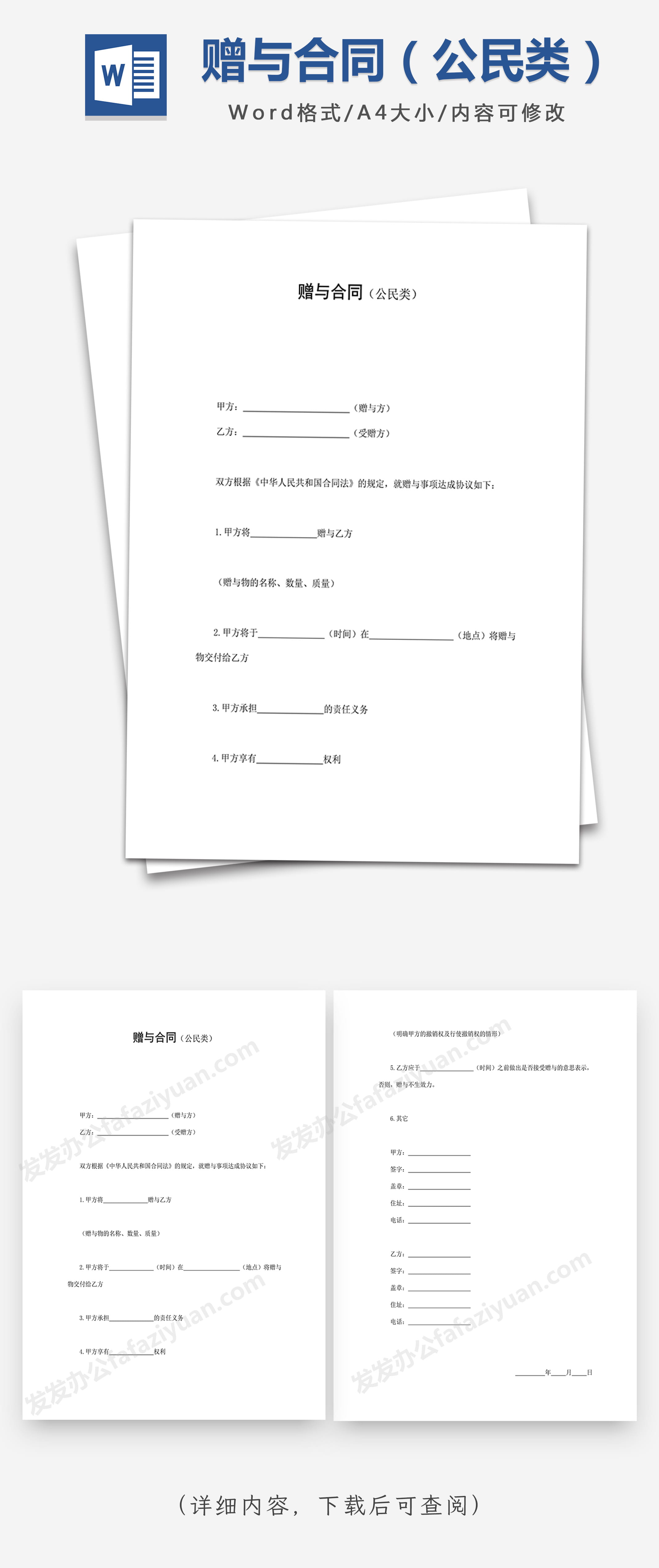 本作品内容为赠与合同(公民类), 格式为 docx, 大小1 MB, 页数为2, 请使用软件Word打开, 作品中主体文字及图片可替换修改,文字修改可直接点击文本框进行编辑,图片更改可选中图片后单击鼠标右键选择更换图片,也可根据自身需求增加和删除作品中的内容, 源文件无水印, 欢迎使用发发资源库。