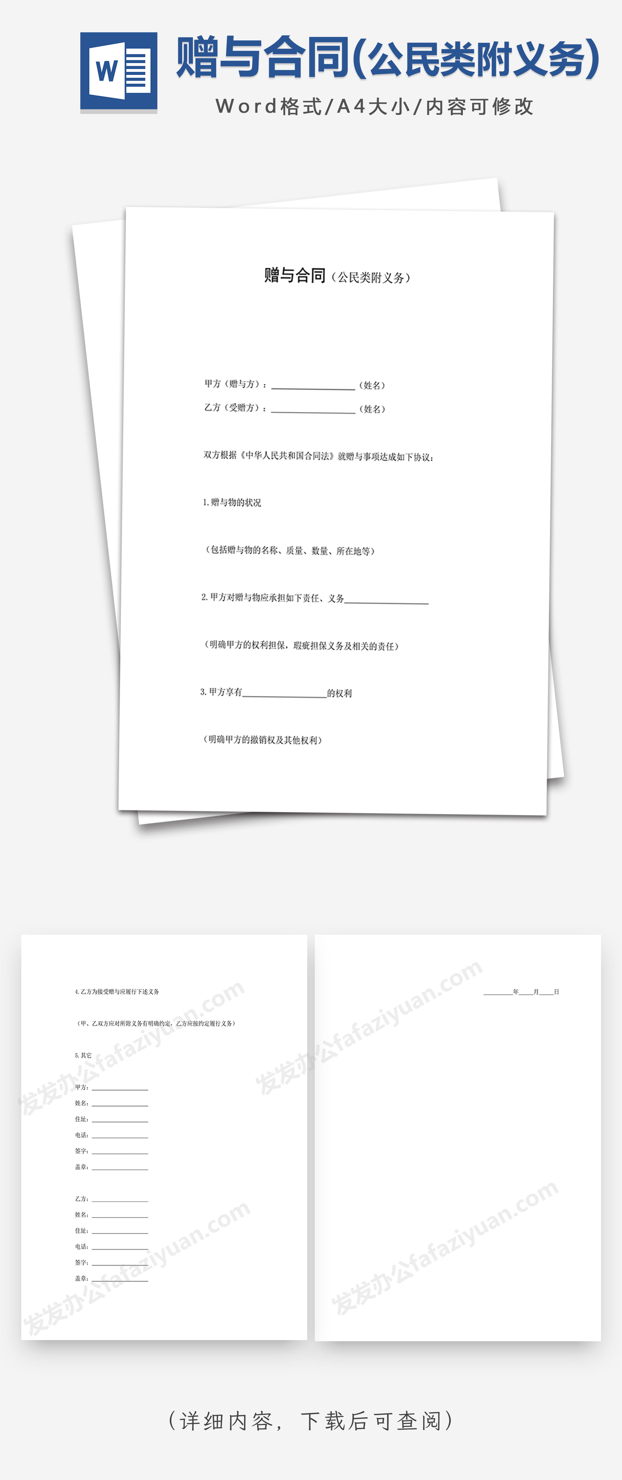 本作品内容为赠与合同(公民类附义务), 格式为 docx, 大小1 MB, 页数为3, 请使用软件Word打开, 作品中主体文字及图片可替换修改,文字修改可直接点击文本框进行编辑,图片更改可选中图片后单击鼠标右键选择更换图片,也可根据自身需求增加和删除作品中的内容, 源文件无水印, 欢迎使用发发资源库。