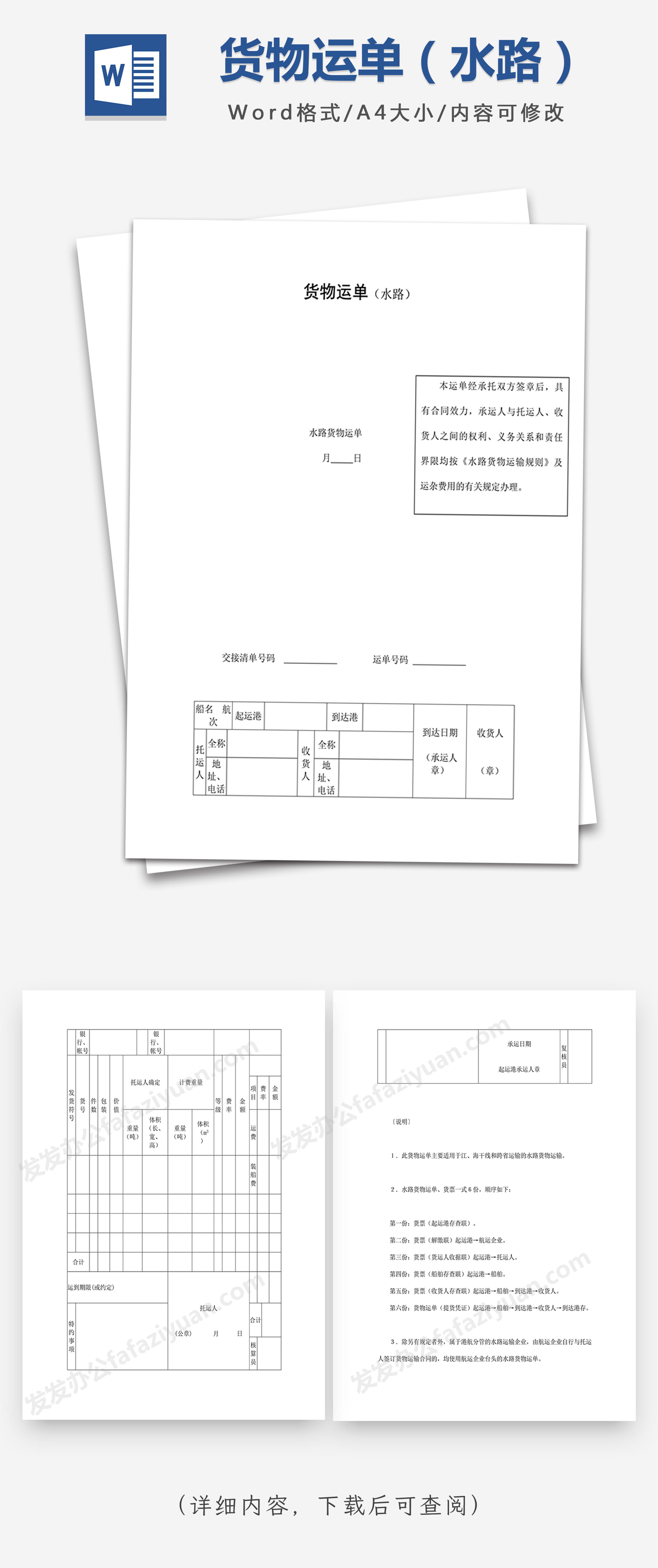本作品内容为货物运单(水路), 格式为 docx, 大小1 MB, 页数为4, 请使用软件Word打开, 作品中主体文字及图片可替换修改,文字修改可直接点击文本框进行编辑,图片更改可选中图片后单击鼠标右键选择更换图片,也可根据自身需求增加和删除作品中的内容, 源文件无水印, 欢迎使用发发资源库。 资源下载此资源下载价格为8.8F币,VIP免费,请先登录