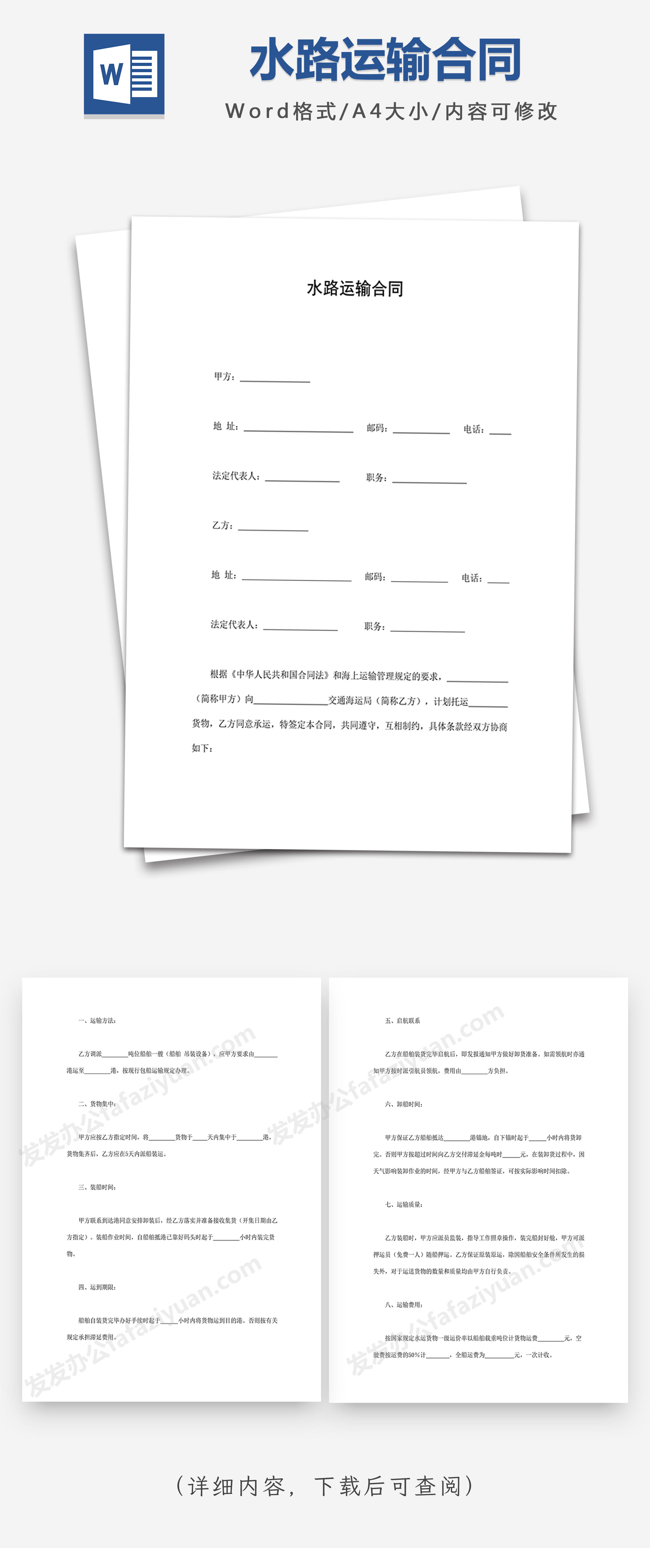 本作品内容为水路运输合同, 格式为 docx, 大小1 MB, 页数为5, 请使用软件Word打开, 作品中主体文字及图片可替换修改,文字修改可直接点击文本框进行编辑,图片更改可选中图片后单击鼠标右键选择更换图片,也可根据自身需求增加和删除作品中的内容, 源文件无水印, 欢迎使用发发资源库。