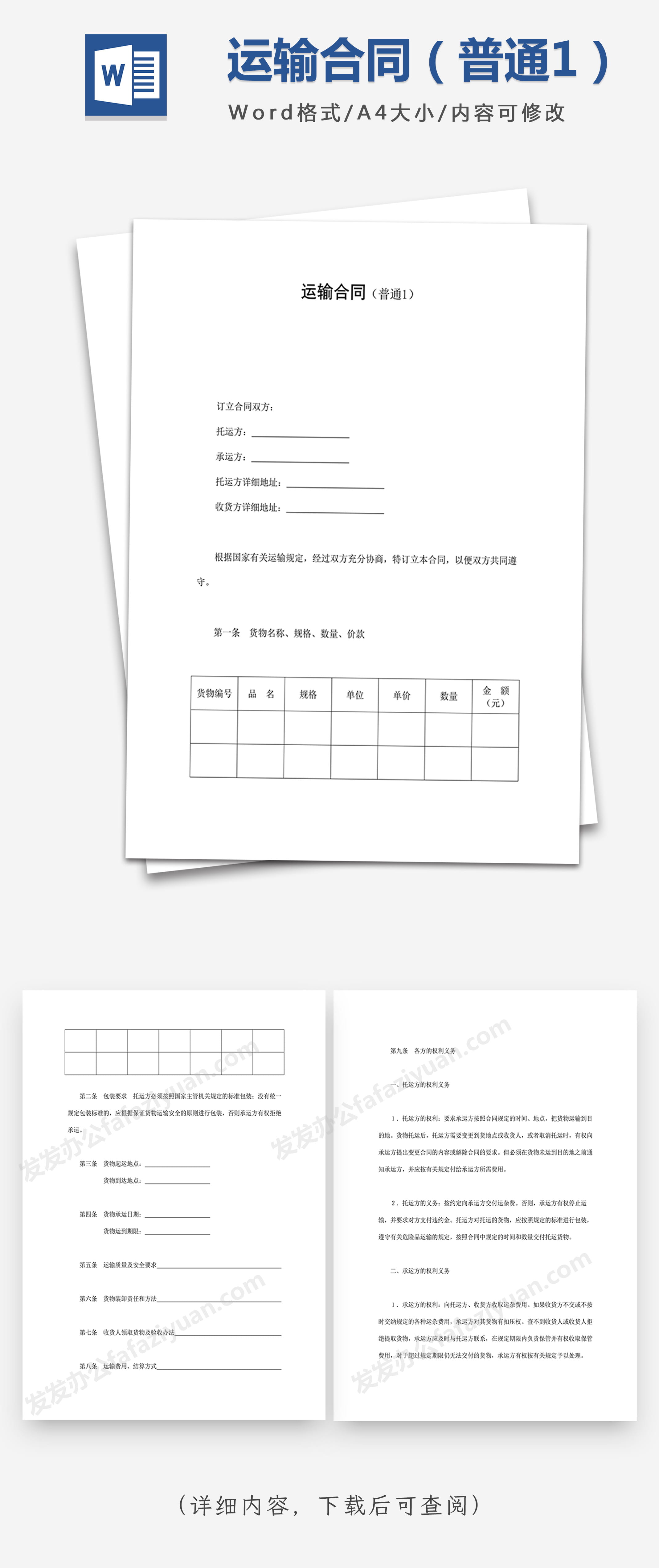本作品内容为运输合同(普通1), 格式为 docx, 大小1 MB, 页数为7, 请使用软件Word打开, 作品中主体文字及图片可替换修改,文字修改可直接点击文本框进行编辑,图片更改可选中图片后单击鼠标右键选择更换图片,也可根据自身需求增加和删除作品中的内容, 源文件无水印, 欢迎使用发发资源库。