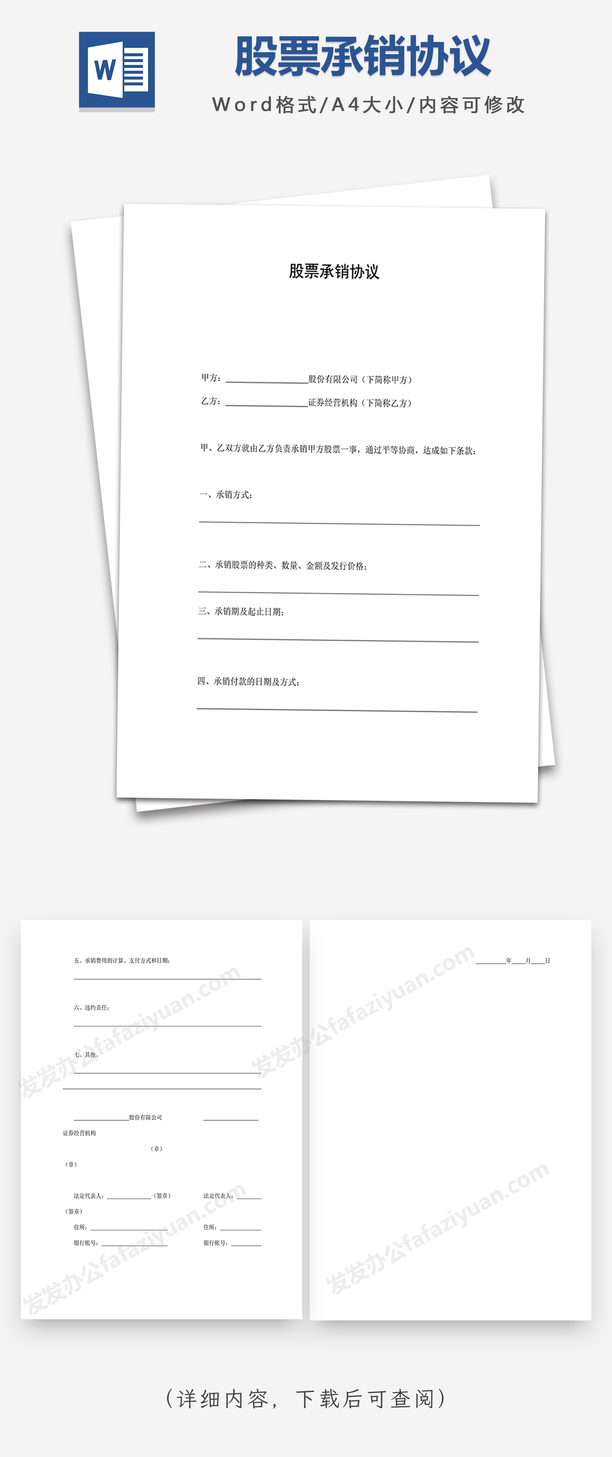 本作品内容为股票承销协议, 格式为 docx, 大小1 MB, 页数为3, 请使用软件Word打开, 作品中主体文字及图片可替换修改,文字修改可直接点击文本框进行编辑,图片更改可选中图片后单击鼠标右键选择更换图片,也可根据自身需求增加和删除作品中的内容, 源文件无水印, 欢迎使用发发资源库。