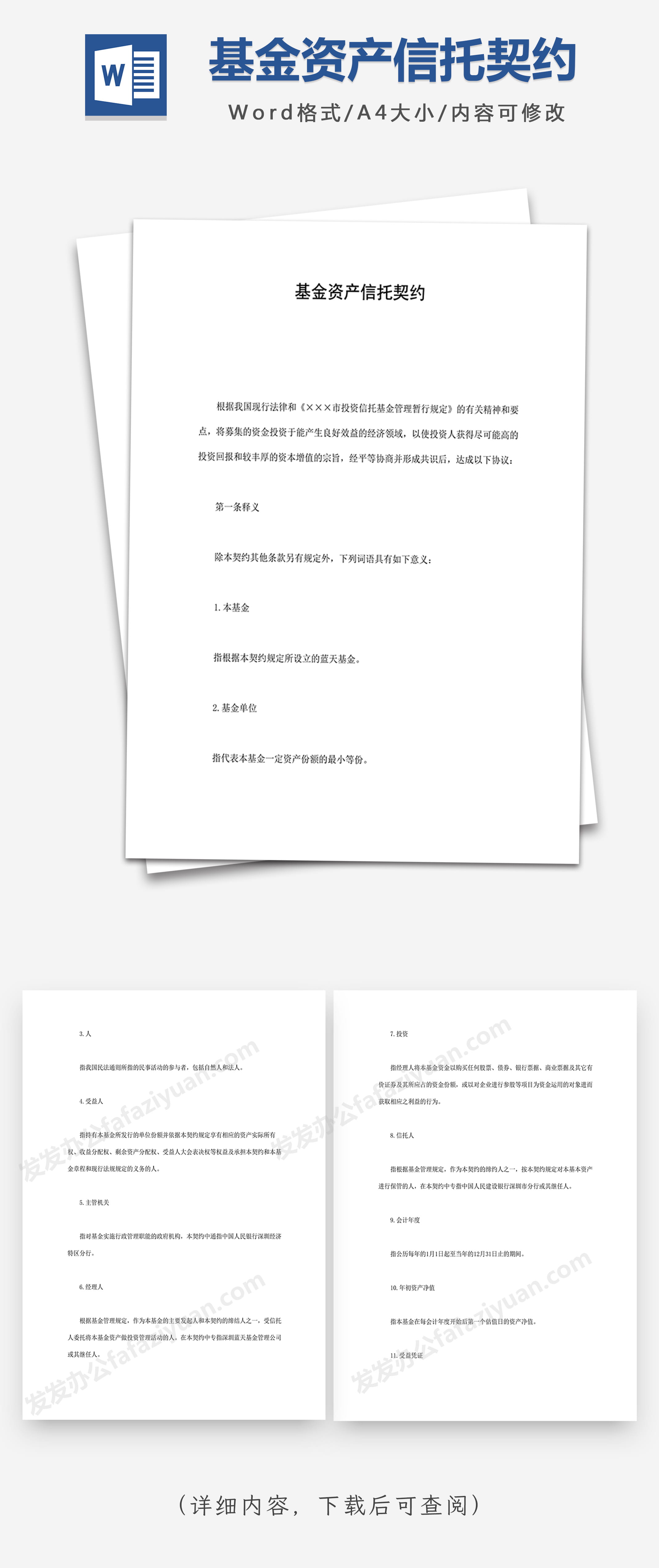 本作品内容为基金资产信托契约, 格式为 docx, 大小1 MB, 页数为43, 请使用软件Word打开, 作品中主体文字及图片可替换修改,文字修改可直接点击文本框进行编辑,图片更改可选中图片后单击鼠标右键选择更换图片,也可根据自身需求增加和删除作品中的内容, 源文件无水印, 欢迎使用发发资源库。
