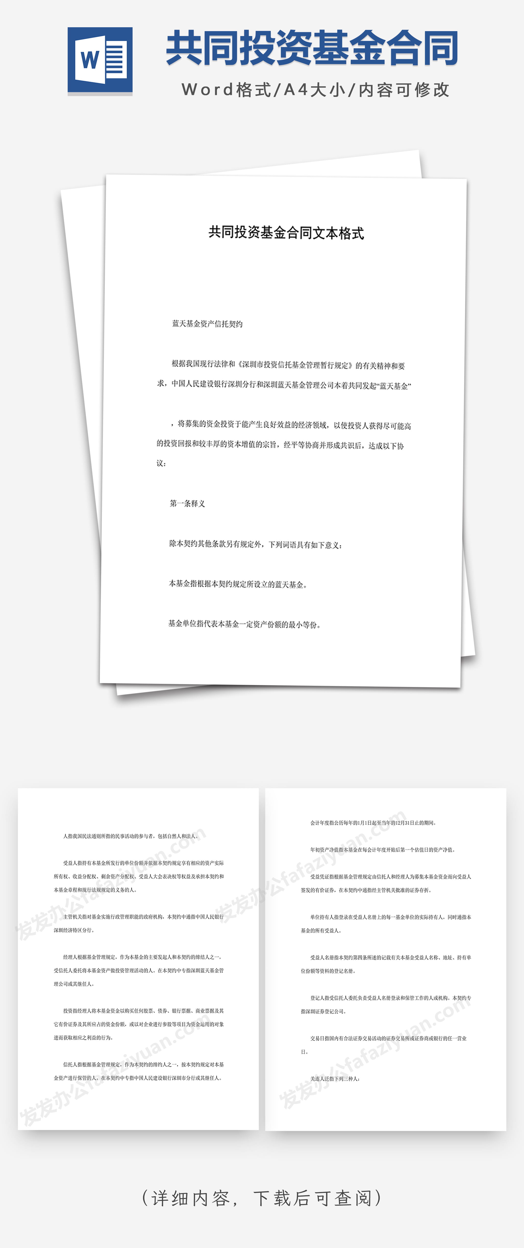 本作品内容为共同投资基金合同文本格式, 格式为 docx, 大小1 MB, 页数为40, 请使用软件Word打开, 作品中主体文字及图片可替换修改,文字修改可直接点击文本框进行编辑,图片更改可选中图片后单击鼠标右键选择更换图片,也可根据自身需求增加和删除作品中的内容, 源文件无水印, 欢迎使用发发资源库。
