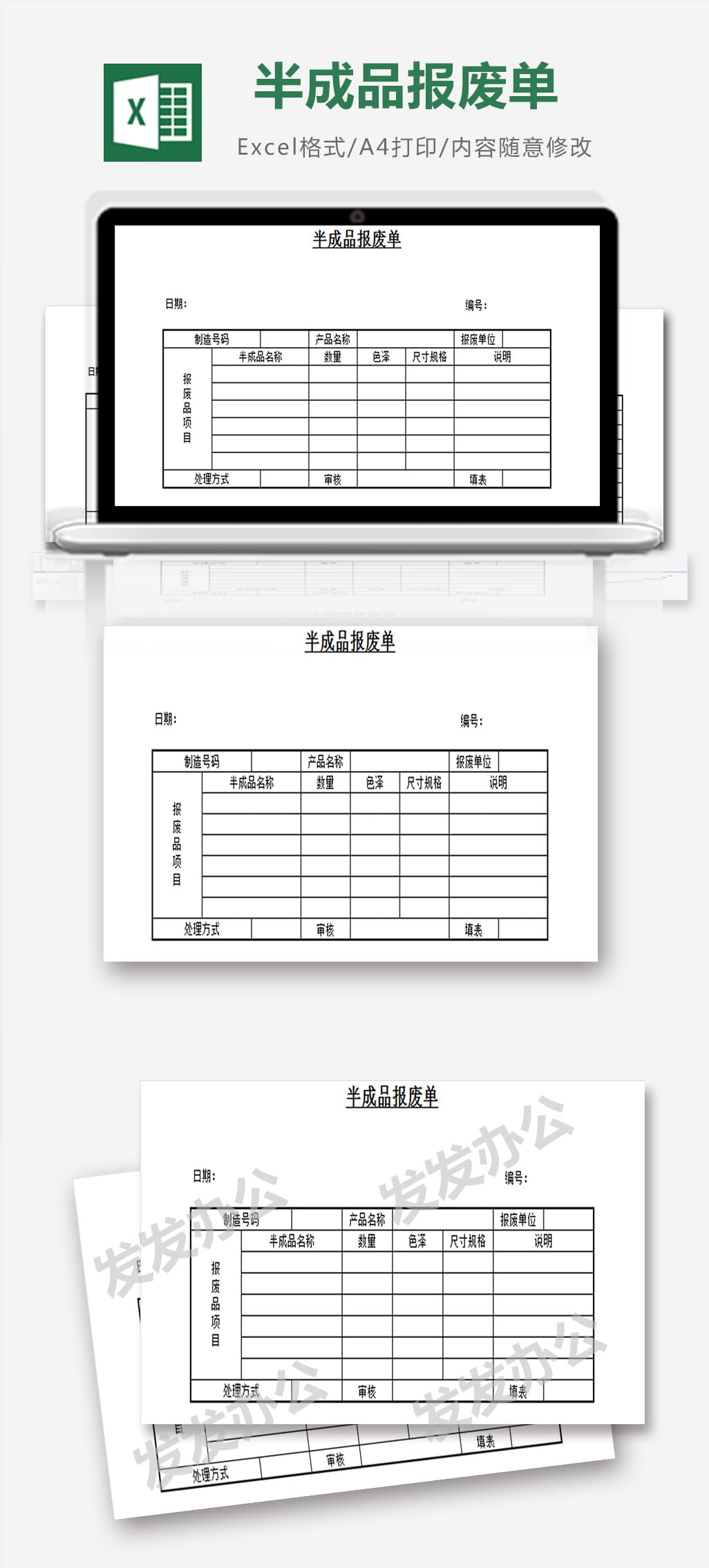 作品内容为半成品报废单Excel表格, 格式为 xlsx, 大小1MB,下载后可直接使用, 请使用软件Excel打开, 作品中主体文字及图片可替换修改,文字修改可直接点击文本框进行编辑,图片更改可选中图片后单击鼠标右键选择更换图片,也可根据自身需求增加和删除作品中的内容, 源文件无水印, 欢迎使用发发资源库。