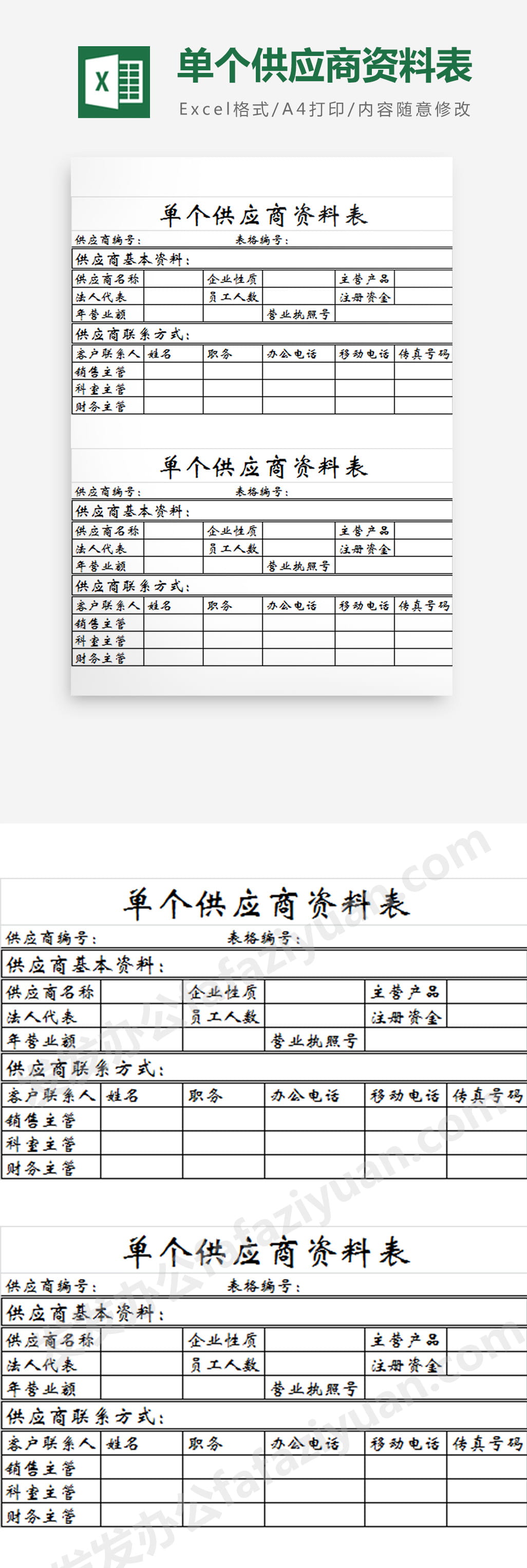 作品内容为单个供应商资料表, 格式为 xlsx, 大小1MB,下载后可直接使用, 请使用软件Excel打开, 作品中主体文字及图片可替换修改,文字修改可直接点击文本框进行编辑,图片更改可选中图片后单击鼠标右键选择更换图片,也可根据自身需求增加和删除作品中的内容, 源文件无水印, 欢迎使用发发资源库。 资源下载此资源仅限注册用户下载,请先登录