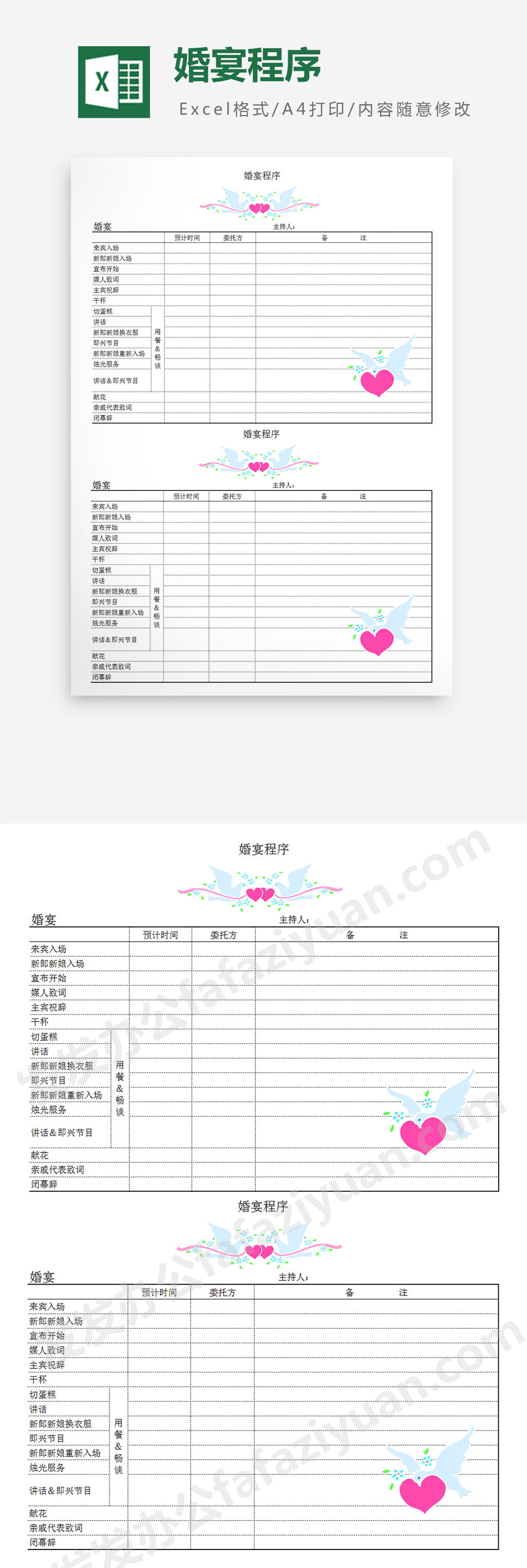 作品内容为婚宴程序Excel模板, 格式为 xlsx, 大小1MB,下载后可直接使用, 请使用软件Excel打开, 作品中主体文字及图片可替换修改,文字修改可直接点击文本框进行编辑,图片更改可选中图片后单击鼠标右键选择更换图片,也可根据自身需求增加和删除作品中的内容, 源文件无水印, 欢迎使用发发资源库。
