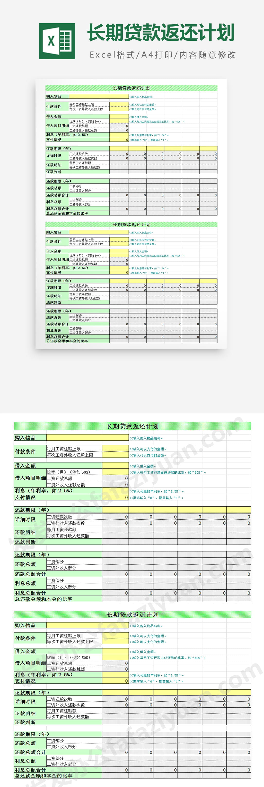 作品内容为长期贷款返还计划, 格式为 xlsx, 大小1MB,下载后可直接使用, 请使用软件Excel打开, 作品中主体文字及图片可替换修改,文字修改可直接点击文本框进行编辑,图片更改可选中图片后单击鼠标右键选择更换图片,也可根据自身需求增加和删除作品中的内容, 源文件无水印, 欢迎使用发发资源库。 资源下载此资源下载价格为8.8F币,VIP免费,请先登录