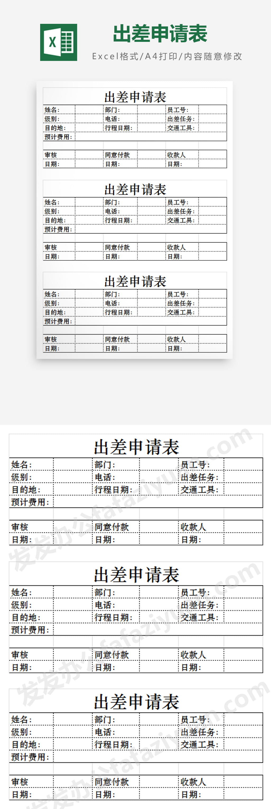 作品内容为出差申请表, 格式为 xlsx, 大小1MB,下载后可直接使用, 请使用软件Excel打开, 作品中主体文字及图片可替换修改,文字修改可直接点击文本框进行编辑,图片更改可选中图片后单击鼠标右键选择更换图片,也可根据自身需求增加和删除作品中的内容, 源文件无水印, 欢迎使用发发资源库。