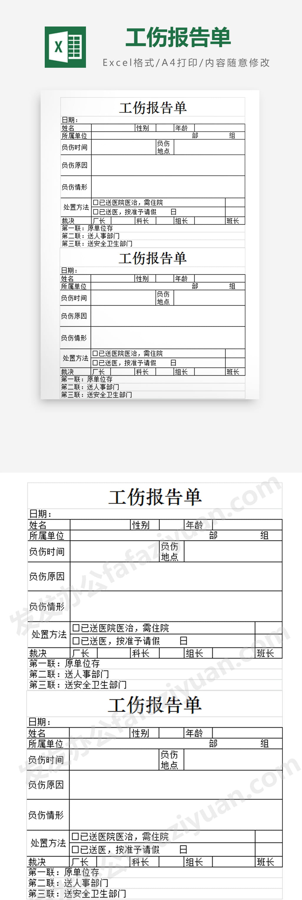 作品内容为工伤报告单Excel模板, 格式为 xlsx, 大小1MB,下载后可直接使用, 请使用软件Excel打开, 作品中主体文字及图片可替换修改,文字修改可直接点击文本框进行编辑,图片更改可选中图片后单击鼠标右键选择更换图片,也可根据自身需求增加和删除作品中的内容, 源文件无水印, 欢迎使用发发资源库。 资源下载此资源下载价格为8.8F币,VIP免费,请先登录
