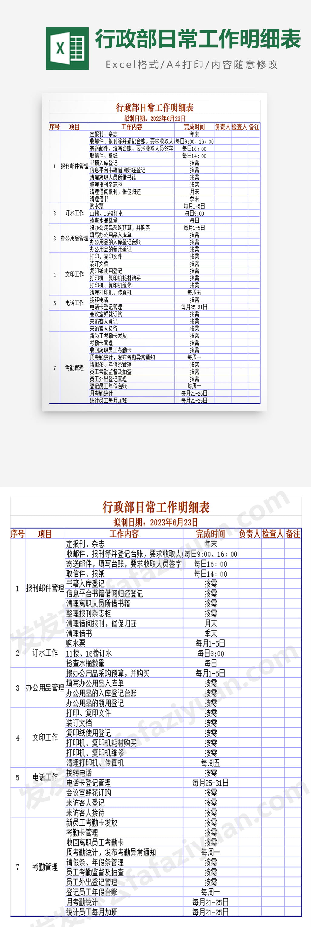 作品内容为行政部日常工作明细表, 格式为 xlsx, 大小1MB,下载后可直接使用, 请使用软件Excel打开, 作品中主体文字及图片可替换修改,文字修改可直接点击文本框进行编辑,图片更改可选中图片后单击鼠标右键选择更换图片,也可根据自身需求增加和删除作品中的内容, 源文件无水印, 欢迎使用发发资源库。 资源下载此资源仅限注册用户下载,请先登录