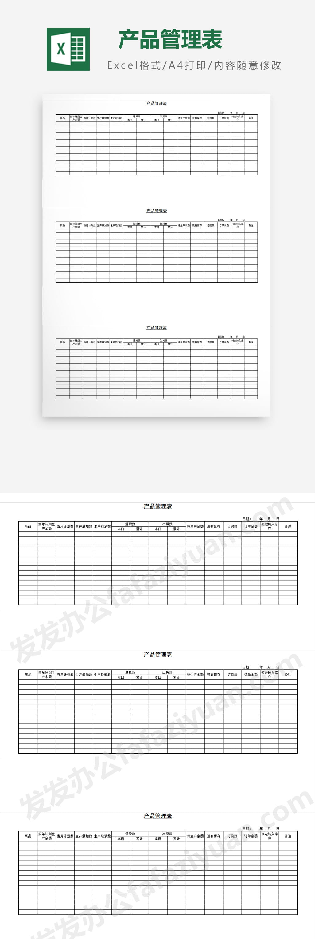 作品内容为产品管理表模板, 格式为 xlsx, 大小1MB,下载后可直接使用, 请使用软件Excel打开, 作品中主体文字及图片可替换修改,文字修改可直接点击文本框进行编辑,图片更改可选中图片后单击鼠标右键选择更换图片,也可根据自身需求增加和删除作品中的内容, 源文件无水印, 欢迎使用发发资源库。