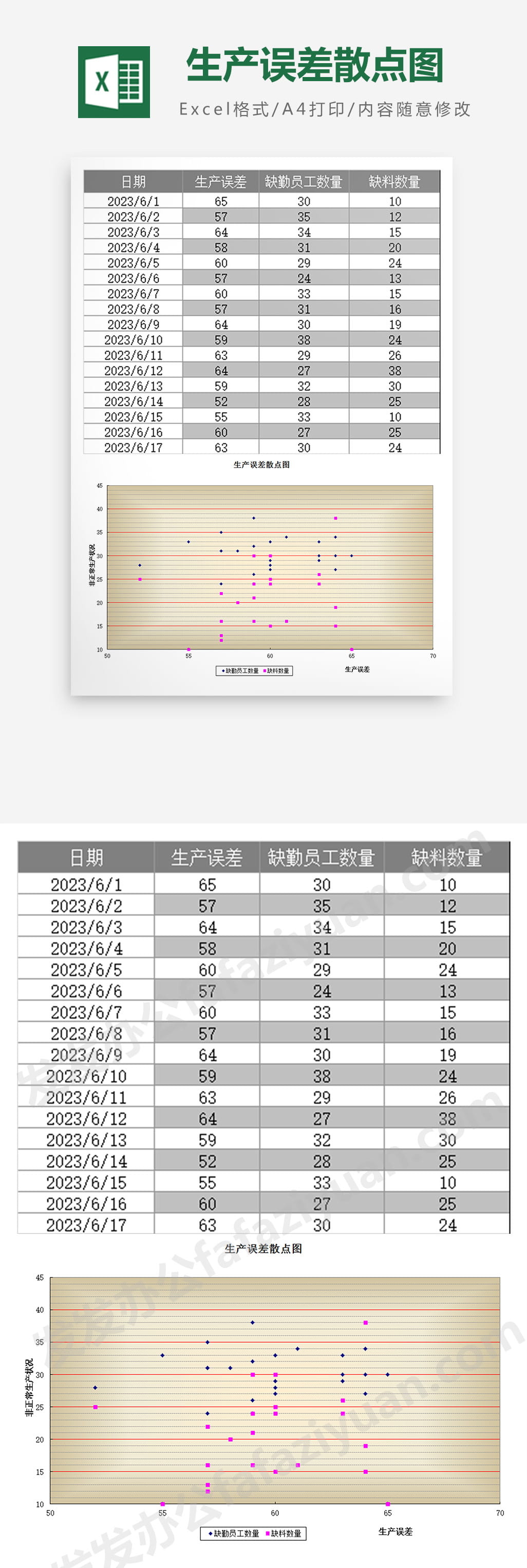 作品内容为生产误差散点图, 格式为 xlsx, 大小1MB,下载后可直接使用, 请使用软件Excel打开, 作品中主体文字及图片可替换修改,文字修改可直接点击文本框进行编辑,图片更改可选中图片后单击鼠标右键选择更换图片,也可根据自身需求增加和删除作品中的内容, 源文件无水印, 欢迎使用发发资源库。