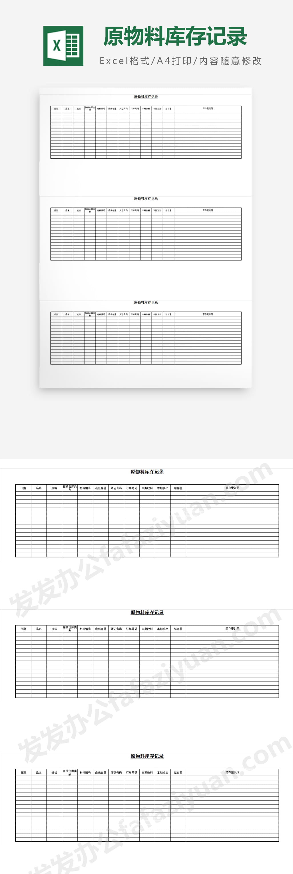 作品内容为原物料库存记录模板, 格式为 xlsx, 大小1MB,下载后可直接使用, 请使用软件Excel打开, 作品中主体文字及图片可替换修改,文字修改可直接点击文本框进行编辑,图片更改可选中图片后单击鼠标右键选择更换图片,也可根据自身需求增加和删除作品中的内容, 源文件无水印, 欢迎使用发发资源库。