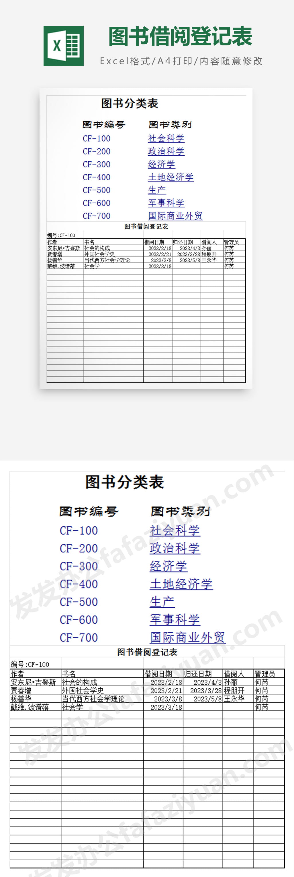 作品内容为图书借阅登记表Excel模板, 格式为 xlsx, 大小1MB,下载后可直接使用, 请使用软件Excel打开, 作品中主体文字及图片可替换修改,文字修改可直接点击文本框进行编辑,图片更改可选中图片后单击鼠标右键选择更换图片,也可根据自身需求增加和删除作品中的内容, 源文件无水印, 欢迎使用发发资源库。