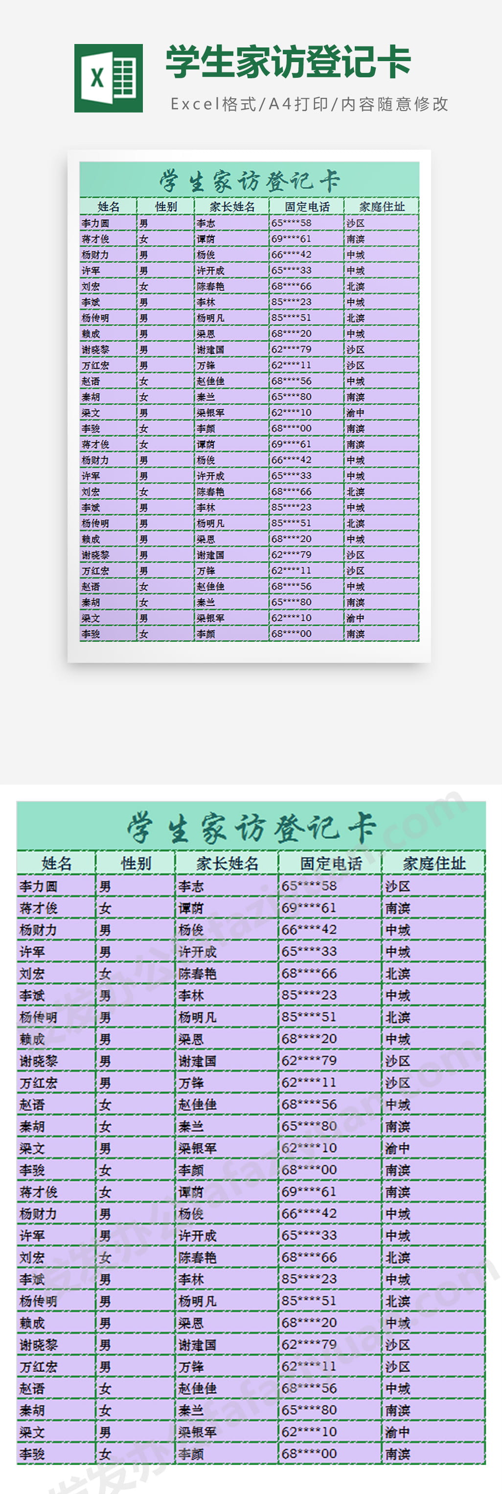 作品内容为学生家访登记卡Excel模板, 格式为 xlsx, 大小1MB,下载后可直接使用, 请使用软件Excel打开, 作品中主体文字及图片可替换修改,文字修改可直接点击文本框进行编辑,图片更改可选中图片后单击鼠标右键选择更换图片,也可根据自身需求增加和删除作品中的内容, 源文件无水印, 欢迎使用发发资源库。 资源下载此资源仅限注册用户下载,请先登录