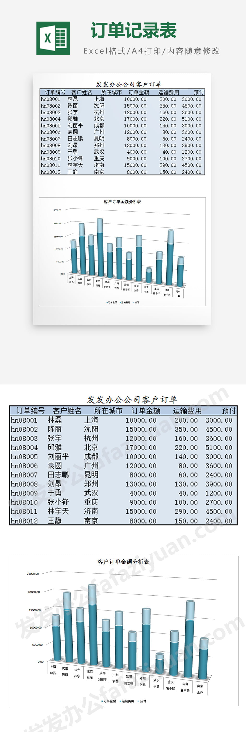 作品内容为订单记录表Excel模板, 格式为 xlsx, 大小1MB,下载后可直接使用, 请使用软件Excel打开, 作品中主体文字及图片可替换修改,文字修改可直接点击文本框进行编辑,图片更改可选中图片后单击鼠标右键选择更换图片,也可根据自身需求增加和删除作品中的内容, 源文件无水印, 欢迎使用发发资源库。