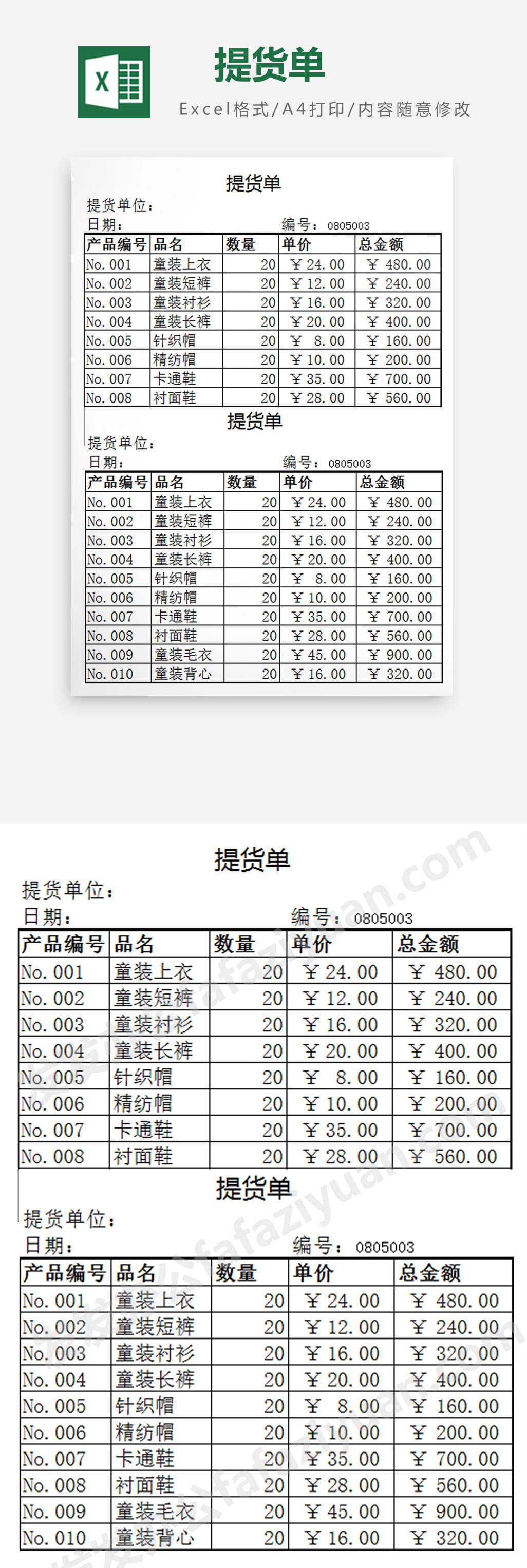 作品内容为提货单Excel模板, 格式为 xlsx, 大小1MB,下载后可直接使用, 请使用软件Excel打开, 作品中主体文字及图片可替换修改,文字修改可直接点击文本框进行编辑,图片更改可选中图片后单击鼠标右键选择更换图片,也可根据自身需求增加和删除作品中的内容, 源文件无水印, 欢迎使用发发资源库。 资源下载此资源仅限注册用户下载,请先登录