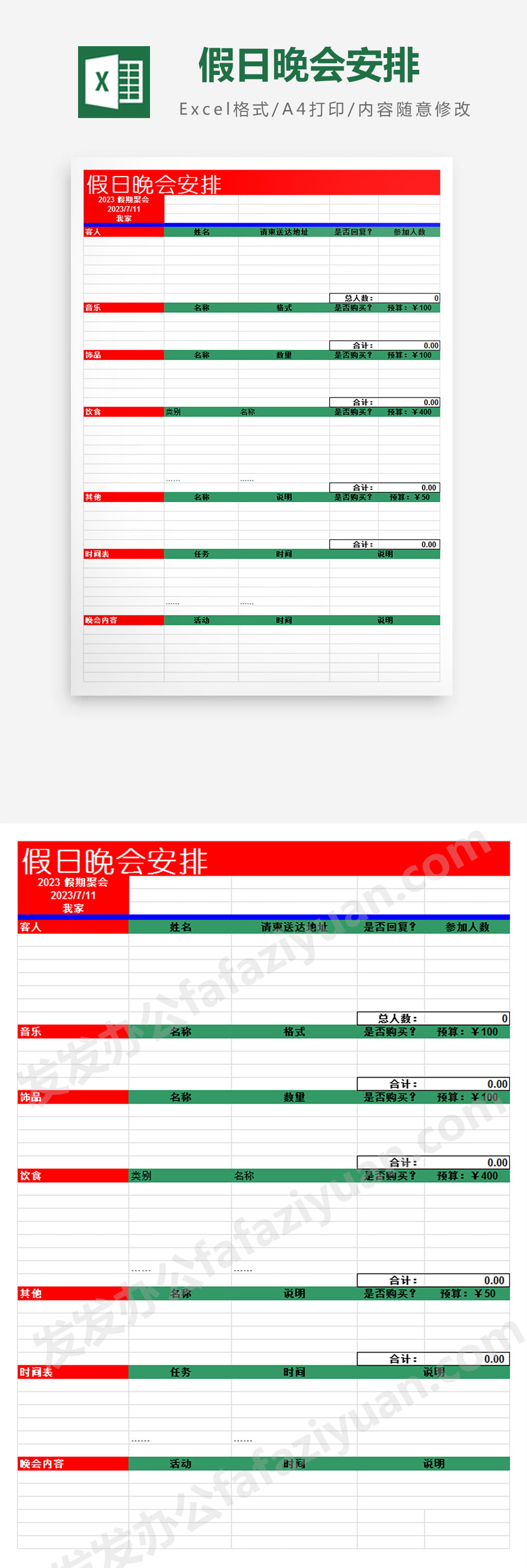作品内容为假日晚会安排Excel模板, 格式为 xlsx, 大小1MB,下载后可直接使用, 请使用软件Excel打开, 作品中主体文字及图片可替换修改,文字修改可直接点击文本框进行编辑,图片更改可选中图片后单击鼠标右键选择更换图片,也可根据自身需求增加和删除作品中的内容, 源文件无水印, 欢迎使用发发资源库。 资源下载此资源仅限注册用户下载,请先登录