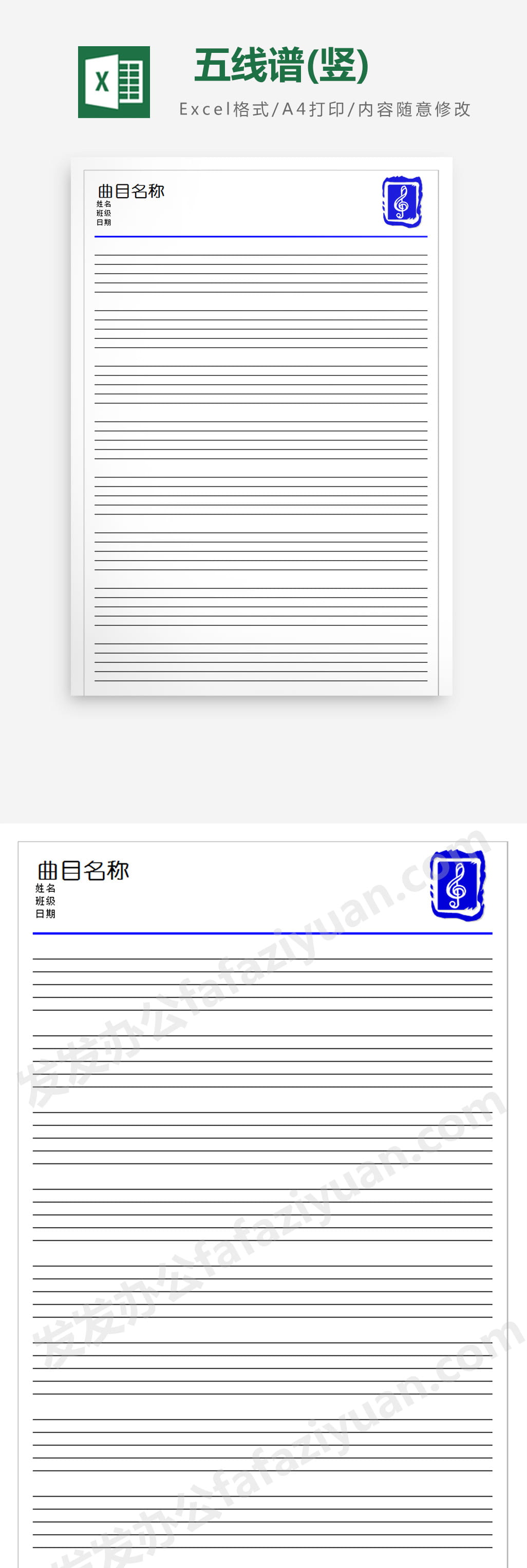 作品内容为五线谱(竖)Excel模板, 格式为 xlsx, 大小1MB,下载后可直接使用, 请使用软件Excel打开, 作品中主体文字及图片可替换修改,文字修改可直接点击文本框进行编辑,图片更改可选中图片后单击鼠标右键选择更换图片,也可根据自身需求增加和删除作品中的内容, 源文件无水印, 欢迎使用发发资源库。 资源下载此资源下载价格为8.8F币,VIP免费,请先登录