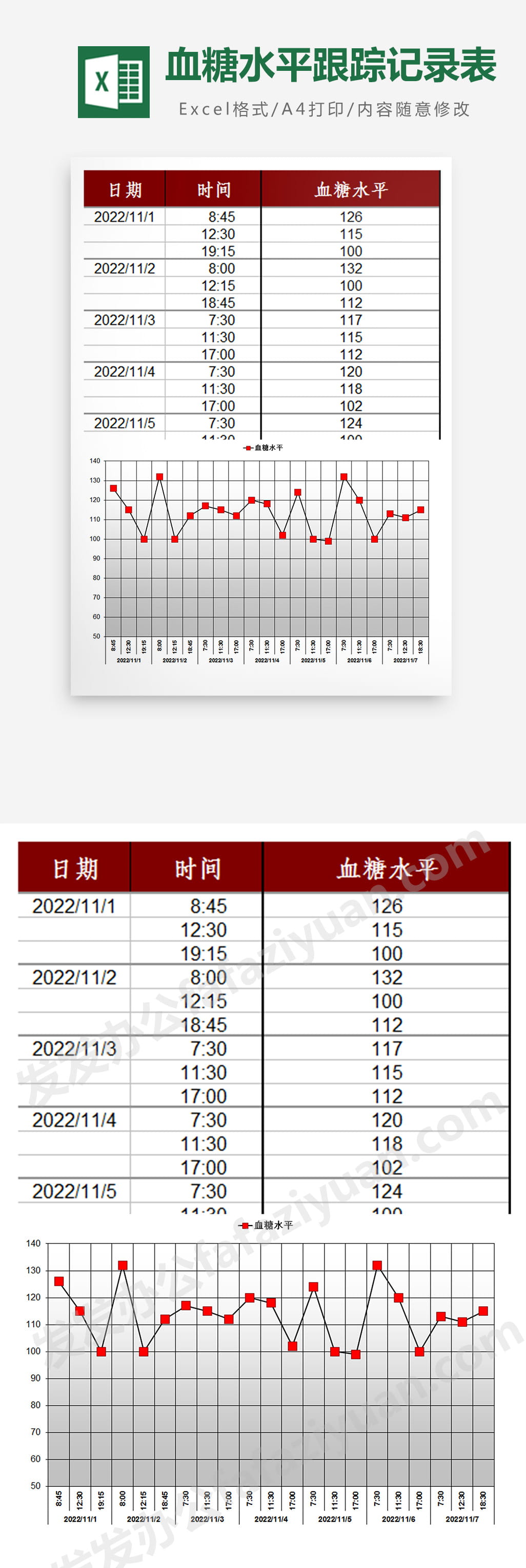 作品内容为血糖水平跟踪记录表, 格式为 xlsx, 大小1MB,下载后可直接使用, 请使用软件Excel打开, 作品中主体文字及图片可替换修改,文字修改可直接点击文本框进行编辑,图片更改可选中图片后单击鼠标右键选择更换图片,也可根据自身需求增加和删除作品中的内容, 源文件无水印, 欢迎使用发发资源库。