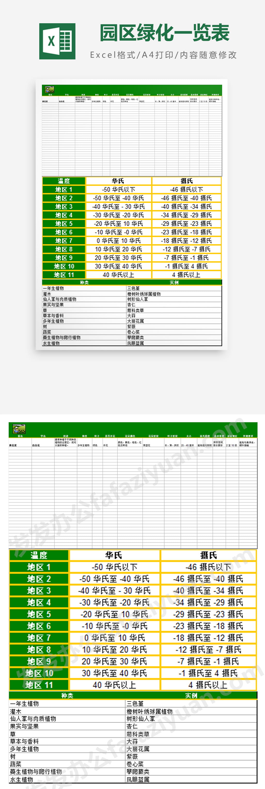 作品内容为园区绿化一览表Excel模板, 格式为 xlsx, 大小1MB,下载后可直接使用, 请使用软件Excel打开, 作品中主体文字及图片可替换修改,文字修改可直接点击文本框进行编辑,图片更改可选中图片后单击鼠标右键选择更换图片,也可根据自身需求增加和删除作品中的内容, 源文件无水印, 欢迎使用发发资源库。