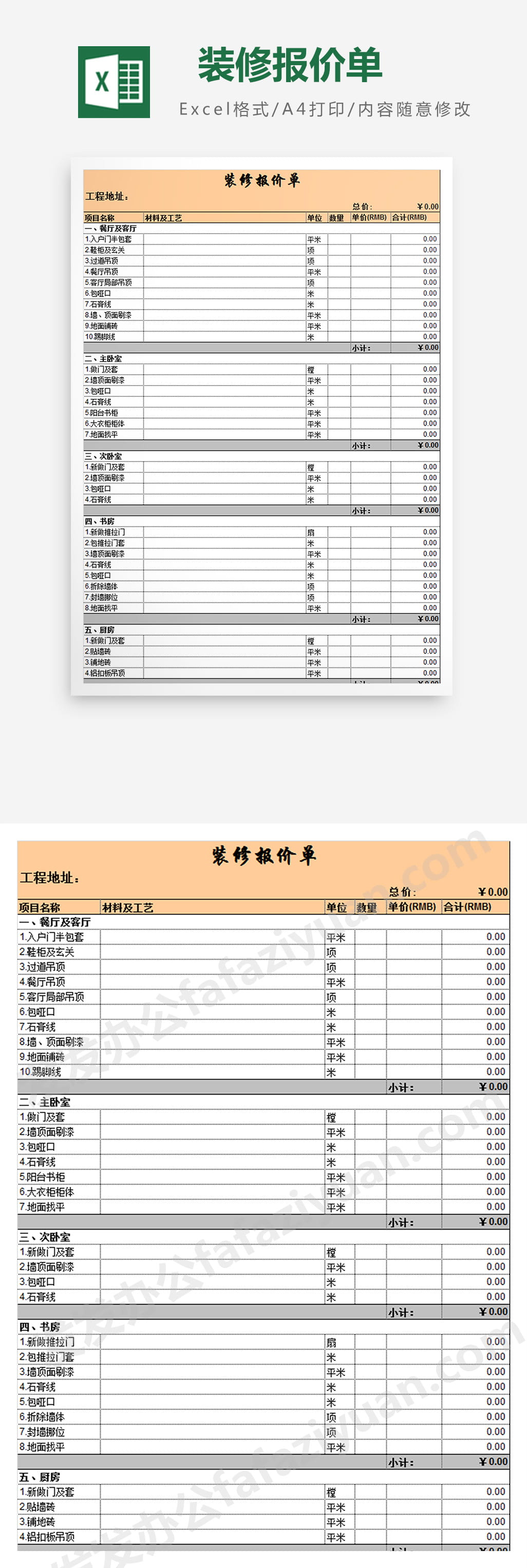 作品内容为装修报价单Excel模板, 格式为 xlsx, 大小1MB,下载后可直接使用, 请使用软件Excel打开, 作品中主体文字及图片可替换修改,文字修改可直接点击文本框进行编辑,图片更改可选中图片后单击鼠标右键选择更换图片,也可根据自身需求增加和删除作品中的内容, 源文件无水印, 欢迎使用发发资源库。 资源下载此资源下载价格为8.8F币,VIP免费,请先登录