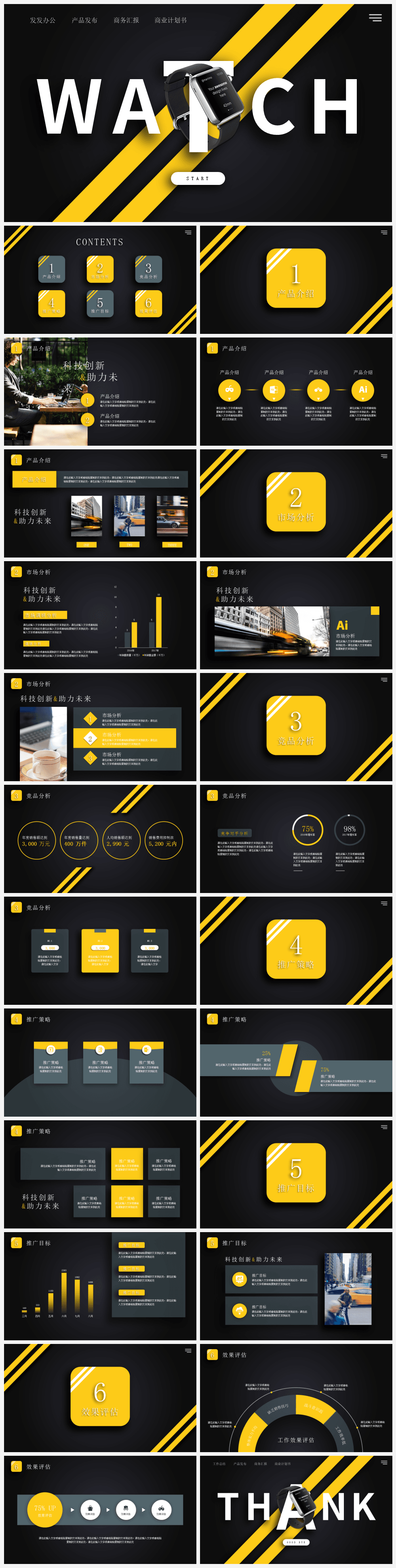 本作品内容为黑色欧美风智能手表发布/产品发布/商务汇报PPT通用模板下载。 格式为 pptx, 大小68.8MB, 页数为25,比例16:9, 请使用软件PowerPoint打开, 作品中主体文字及图片可替换修改,文字修改可直接点击文本框进行编辑,图片更改可选中图片后单击鼠标右键选择更换图片,也可根据自身需求增加和删除作品中的内容, 源文件无水印, 欢迎使用发发资源库。