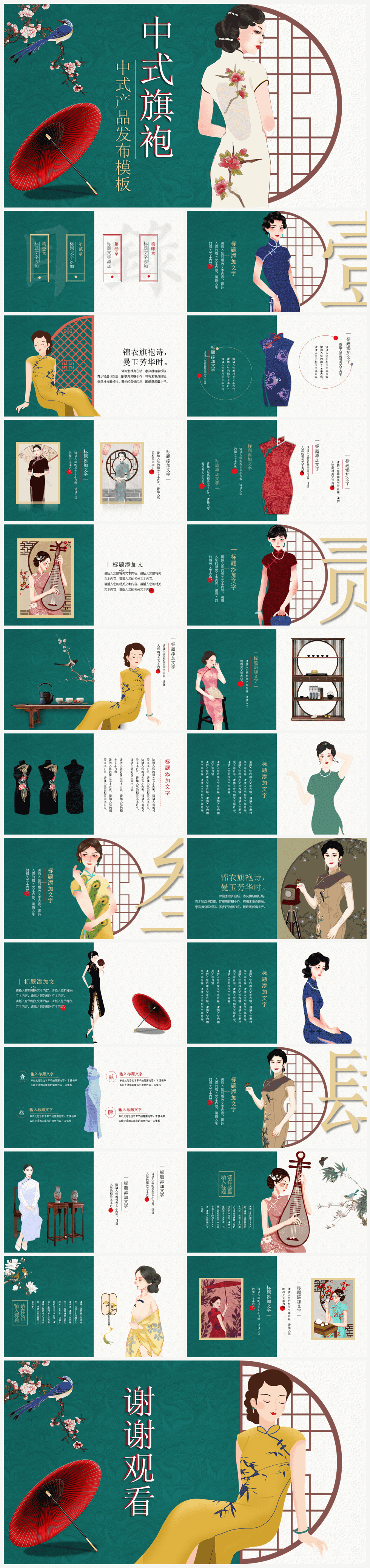 本作品内容为中国风中式旗袍产品发布/中式产品介绍PPT通用模板。 格式为 pptx, 大小36.8MB, 页数为24,比例16:9, 请使用软件PowerPoint打开, 作品中主体文字及图片可替换修改,文字修改可直接点击文本框进行编辑,图片更改可选中图片后单击鼠标右键选择更换图片,也可根据自身需求增加和删除作品中的内容, 源文件无水印, 欢迎使用发发资源库。