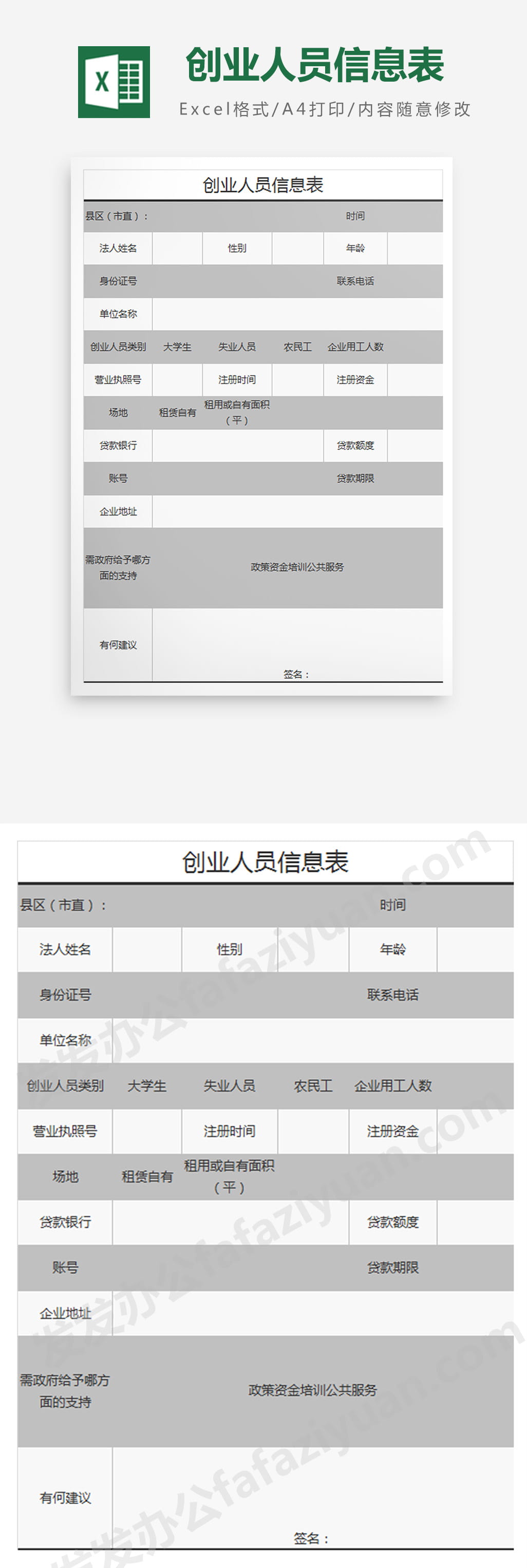 作品内容为创业人员信息表, 格式为 xlsx, 大小1MB,下载后可直接使用, 请使用软件Excel打开, 作品中主体文字及图片可替换修改,文字修改可直接点击文本框进行编辑,图片更改可选中图片后单击鼠标右键选择更换图片,也可根据自身需求增加和删除作品中的内容, 源文件无水印, 欢迎使用发发资源库。