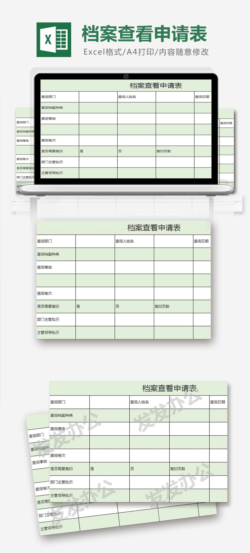 作品内容为档案查看申请表, 格式为 xlsx, 大小1MB,下载后可直接使用, 请使用软件Excel打开, 作品中主体文字及图片可替换修改,文字修改可直接点击文本框进行编辑,图片更改可选中图片后单击鼠标右键选择更换图片,也可根据自身需求增加和删除作品中的内容, 源文件无水印, 欢迎使用发发资源库。 资源下载此资源下载价格为8.8F币,VIP免费,请先登录