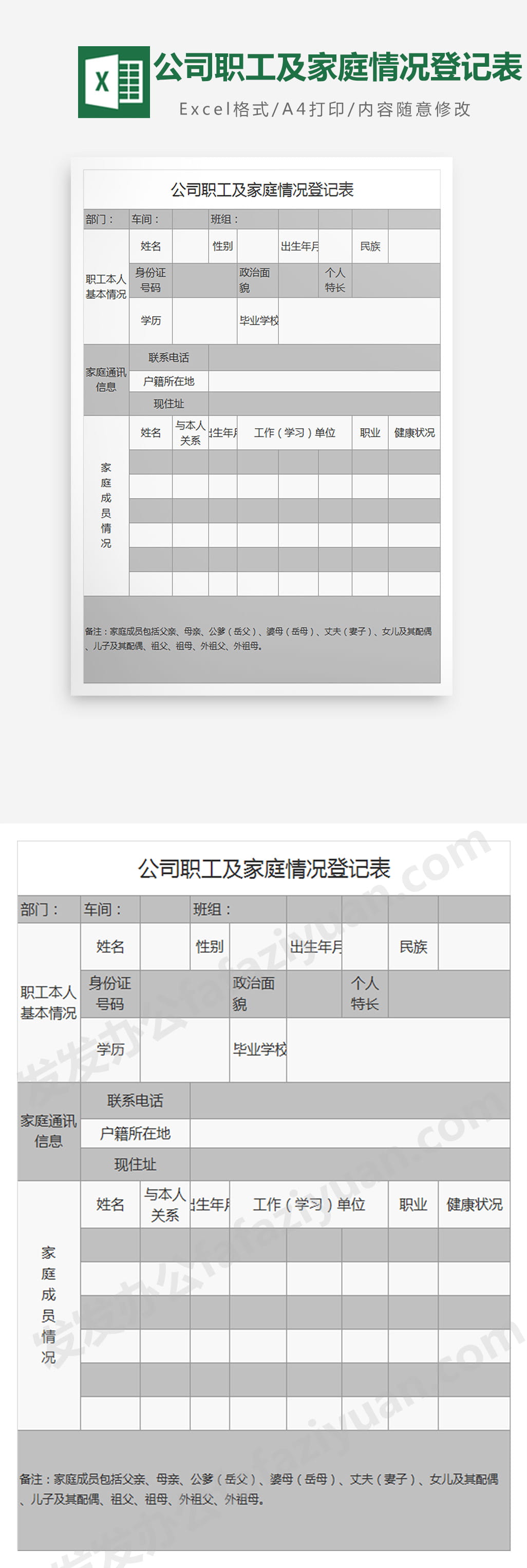 作品内容为公司职工及家庭情况登记表, 格式为 xlsx, 大小1MB,下载后可直接使用, 请使用软件Excel打开, 作品中主体文字及图片可替换修改,文字修改可直接点击文本框进行编辑,图片更改可选中图片后单击鼠标右键选择更换图片,也可根据自身需求增加和删除作品中的内容, 源文件无水印, 欢迎使用发发资源库。 资源下载此资源下载价格为8.8F币,VIP免费,请先登录