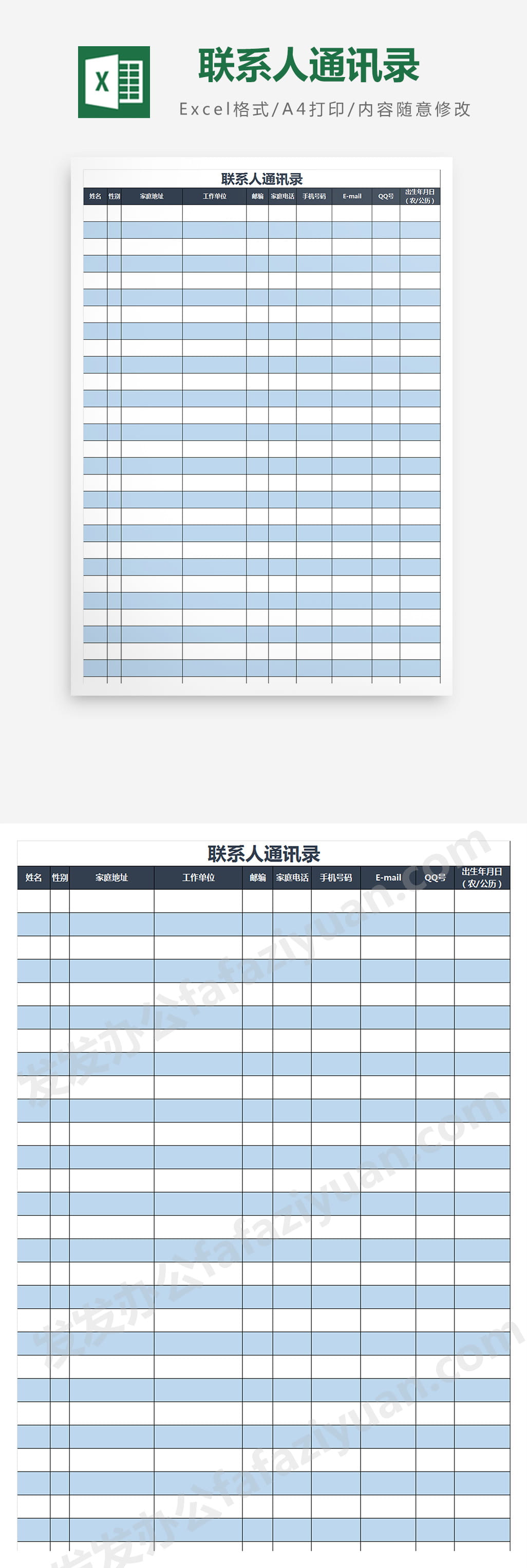 作品内容为联系人通讯录Excel表格, 格式为 xlsx, 大小1MB,下载后可直接使用, 请使用软件Excel打开, 作品中主体文字及图片可替换修改,文字修改可直接点击文本框进行编辑,图片更改可选中图片后单击鼠标右键选择更换图片,也可根据自身需求增加和删除作品中的内容, 源文件无水印, 欢迎使用发发资源库。 资源下载此资源仅限注册用户下载,请先登录