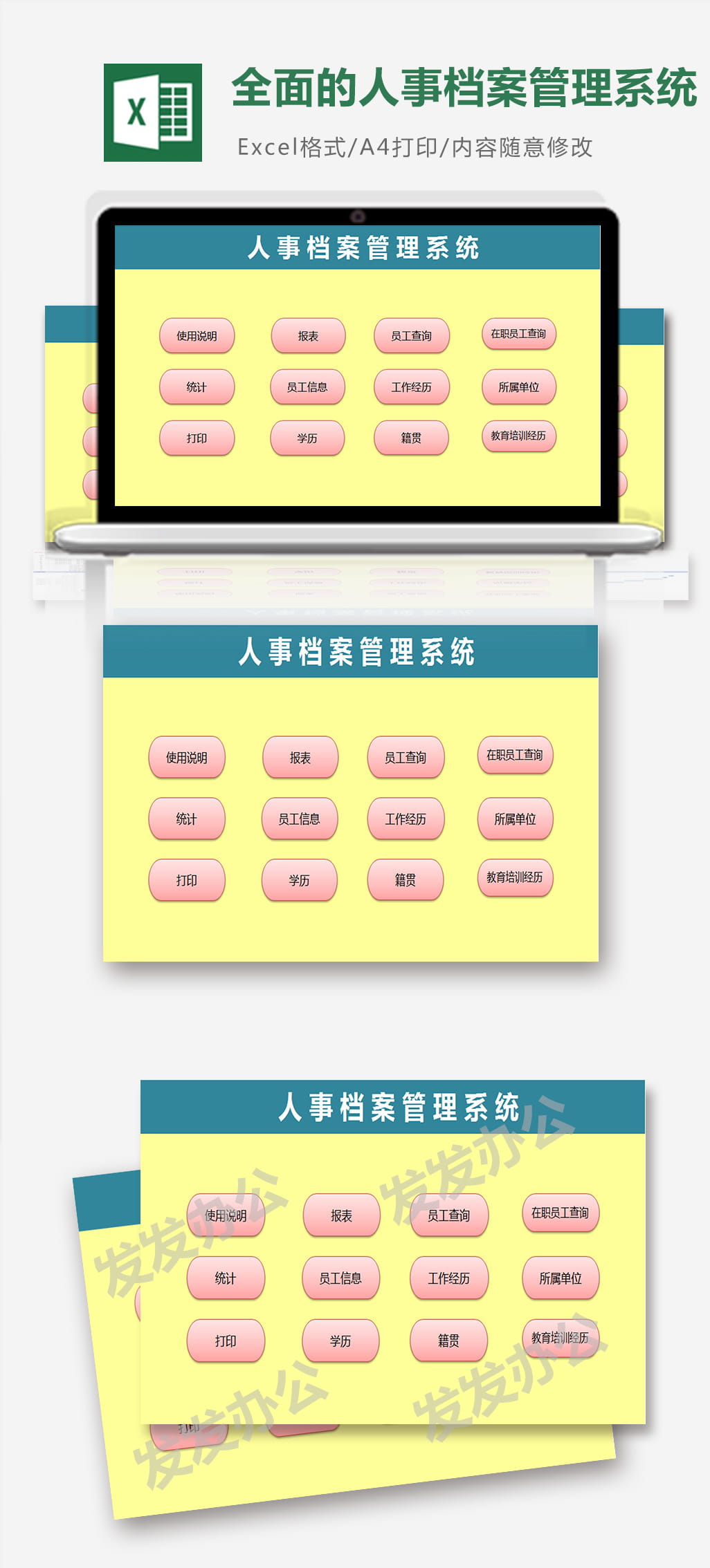 作品内容为全面的人事档案管理系统, 格式为 xlsx, 大小1MB,下载后可直接使用, 请使用软件Excel打开, 作品中主体文字及图片可替换修改,文字修改可直接点击文本框进行编辑,图片更改可选中图片后单击鼠标右键选择更换图片,也可根据自身需求增加和删除作品中的内容, 源文件无水印, 欢迎使用发发资源库。