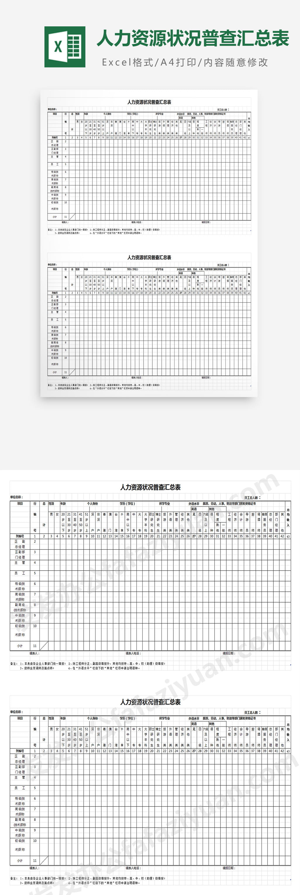 作品内容为人力资源状况普查汇总表, 格式为 xlsx, 大小1MB,下载后可直接使用, 请使用软件Excel打开, 作品中主体文字及图片可替换修改,文字修改可直接点击文本框进行编辑,图片更改可选中图片后单击鼠标右键选择更换图片,也可根据自身需求增加和删除作品中的内容, 源文件无水印, 欢迎使用发发资源库。