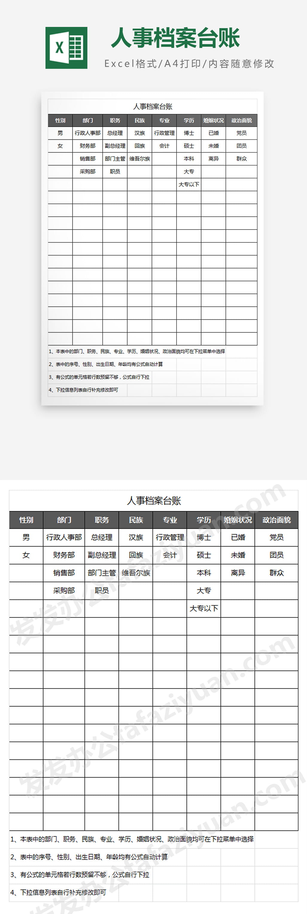作品内容为人事档案台账Excel模板, 格式为 xlsx, 大小1MB,下载后可直接使用, 请使用软件Excel打开, 作品中主体文字及图片可替换修改,文字修改可直接点击文本框进行编辑,图片更改可选中图片后单击鼠标右键选择更换图片,也可根据自身需求增加和删除作品中的内容, 源文件无水印, 欢迎使用发发资源库。