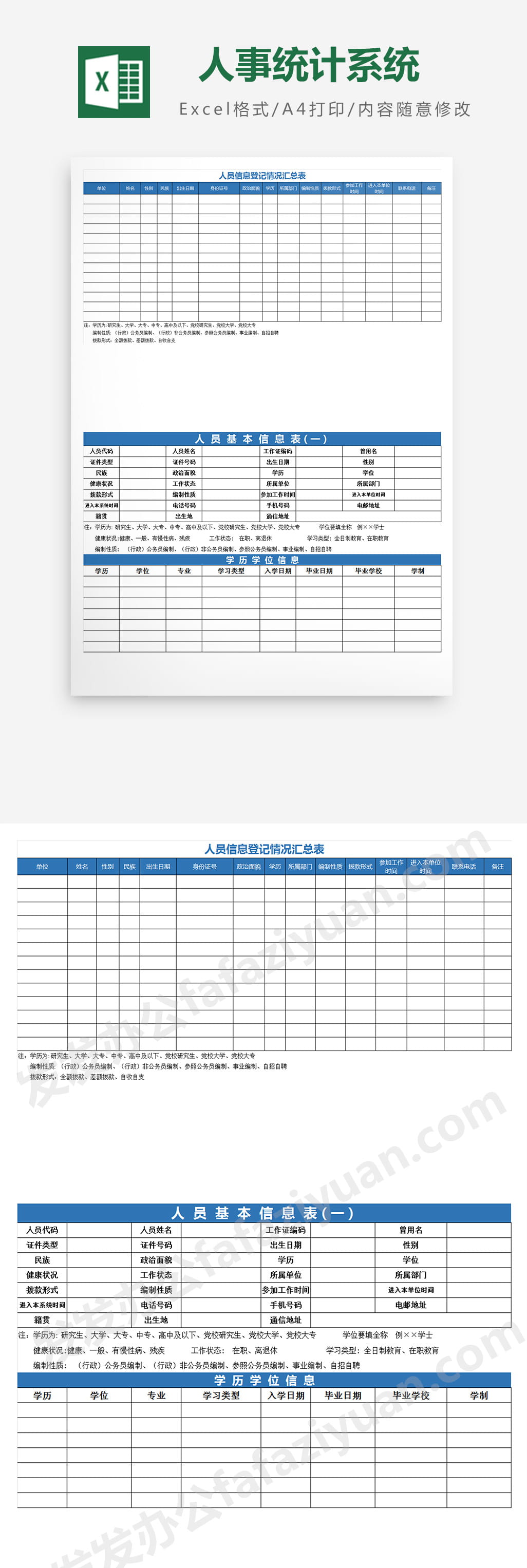 作品内容为人事统计系统完整的个人信息采录表, 格式为 xlsx, 大小1MB,下载后可直接使用, 请使用软件Excel打开, 作品中主体文字及图片可替换修改,文字修改可直接点击文本框进行编辑,图片更改可选中图片后单击鼠标右键选择更换图片,也可根据自身需求增加和删除作品中的内容, 源文件无水印, 欢迎使用发发资源库。