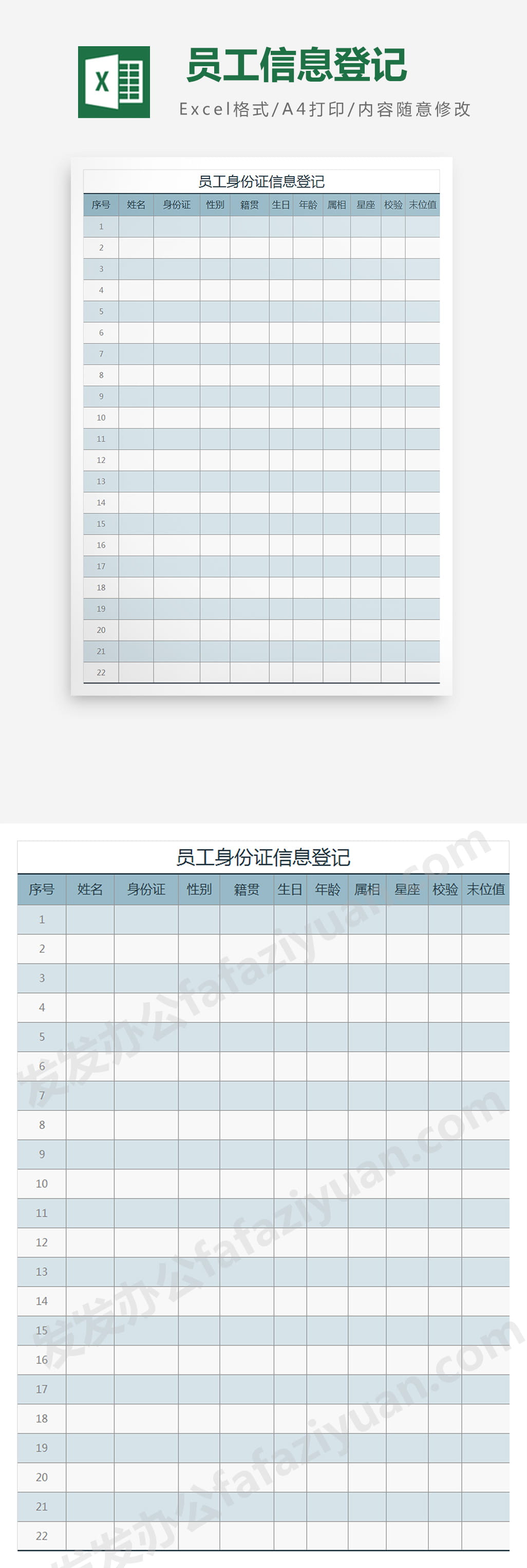 作品内容为员工信息登记, 格式为 xlsx, 大小1MB,下载后可直接使用, 请使用软件Excel打开, 作品中主体文字及图片可替换修改,文字修改可直接点击文本框进行编辑,图片更改可选中图片后单击鼠标右键选择更换图片,也可根据自身需求增加和删除作品中的内容, 源文件无水印, 欢迎使用发发资源库。