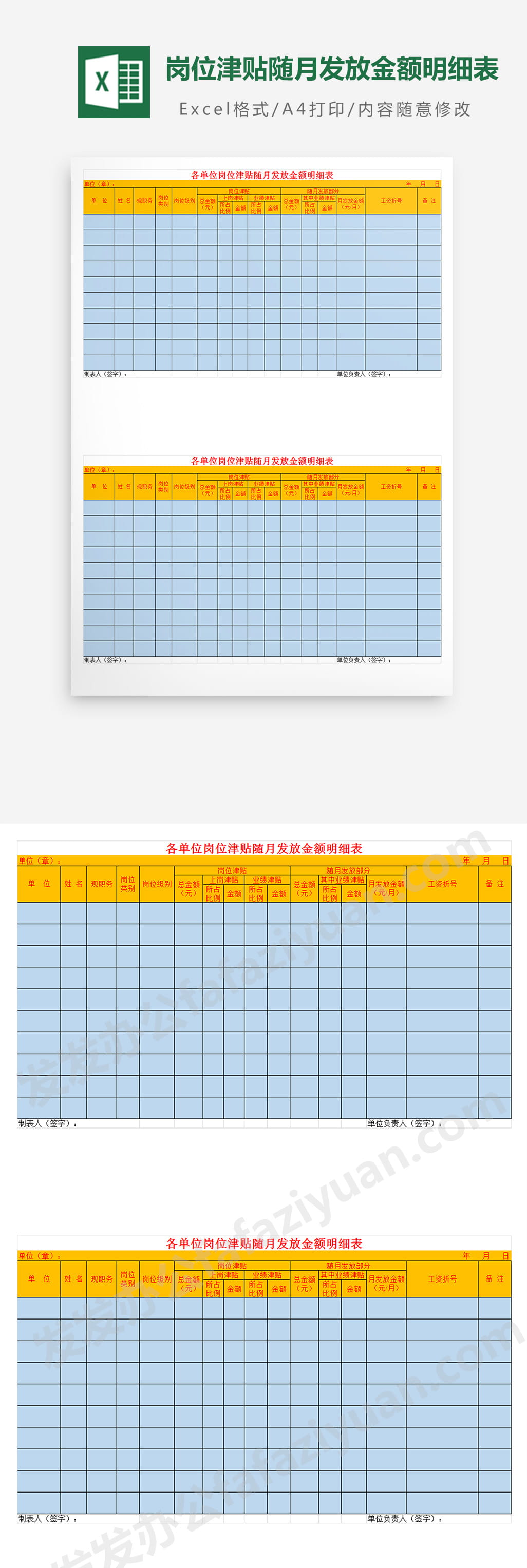 作品内容为各单位岗位津贴随月发放金额明细表, 格式为 xlsx, 大小1MB,下载后可直接使用, 请使用软件Excel打开, 作品中主体文字及图片可替换修改,文字修改可直接点击文本框进行编辑,图片更改可选中图片后单击鼠标右键选择更换图片,也可根据自身需求增加和删除作品中的内容, 源文件无水印, 欢迎使用发发资源库。
