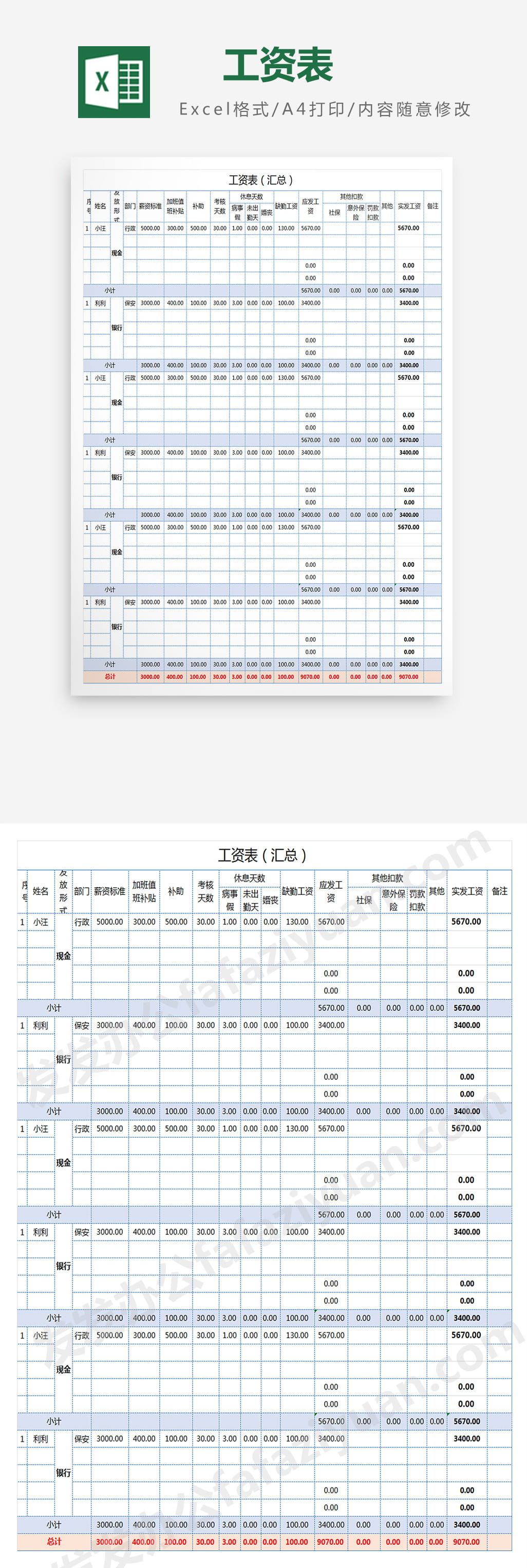 作品内容为工资表, 格式为 xlsx, 大小1MB,下载后可直接使用, 请使用软件Excel打开, 作品中主体文字及图片可替换修改,文字修改可直接点击文本框进行编辑,图片更改可选中图片后单击鼠标右键选择更换图片,也可根据自身需求增加和删除作品中的内容, 源文件无水印, 欢迎使用发发资源库。 资源下载此资源下载价格为8.8F币,VIP免费,请先登录