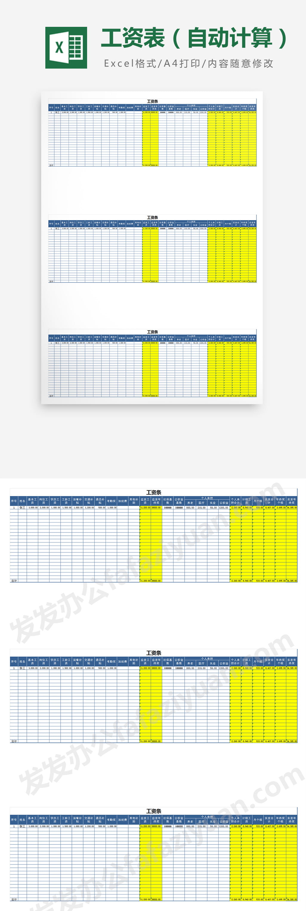 作品内容为工资表(自动计算), 格式为 xlsx, 大小1MB,下载后可直接使用, 请使用软件Excel打开, 作品中主体文字及图片可替换修改,文字修改可直接点击文本框进行编辑,图片更改可选中图片后单击鼠标右键选择更换图片,也可根据自身需求增加和删除作品中的内容, 源文件无水印, 欢迎使用发发资源库。