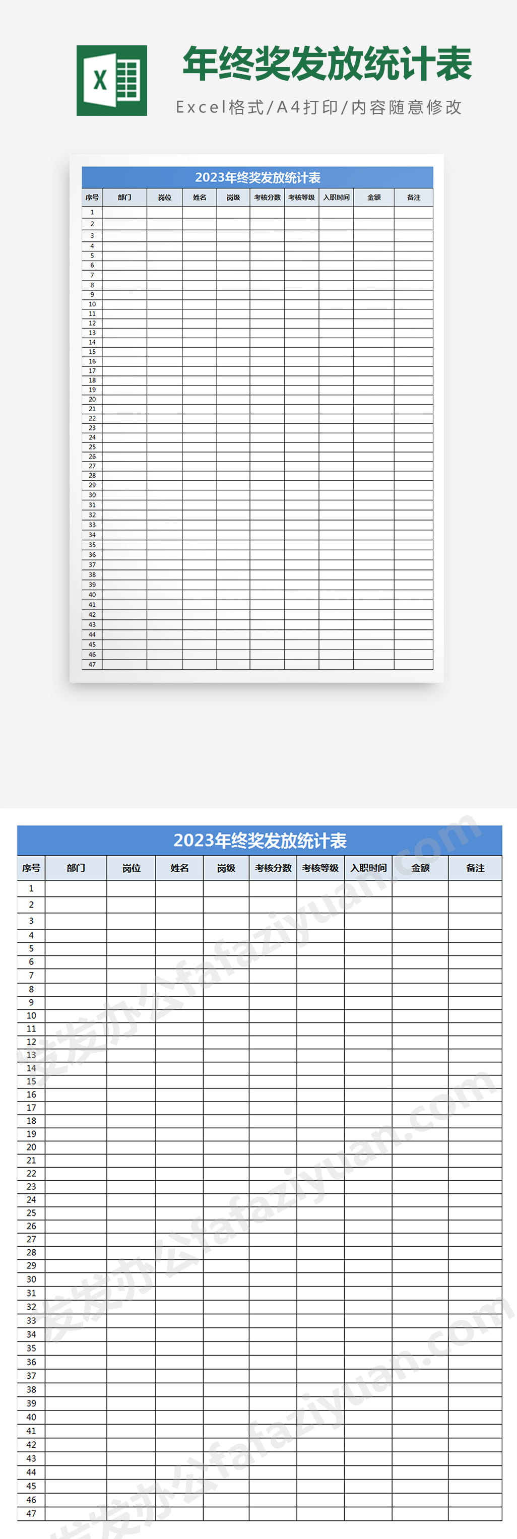 作品内容为年终奖发放统计表, 格式为 xlsx, 大小1MB,下载后可直接使用, 请使用软件Excel打开, 作品中主体文字及图片可替换修改,文字修改可直接点击文本框进行编辑,图片更改可选中图片后单击鼠标右键选择更换图片,也可根据自身需求增加和删除作品中的内容, 源文件无水印, 欢迎使用发发资源库。 资源下载此资源下载价格为8.8F币,VIP免费,请先登录