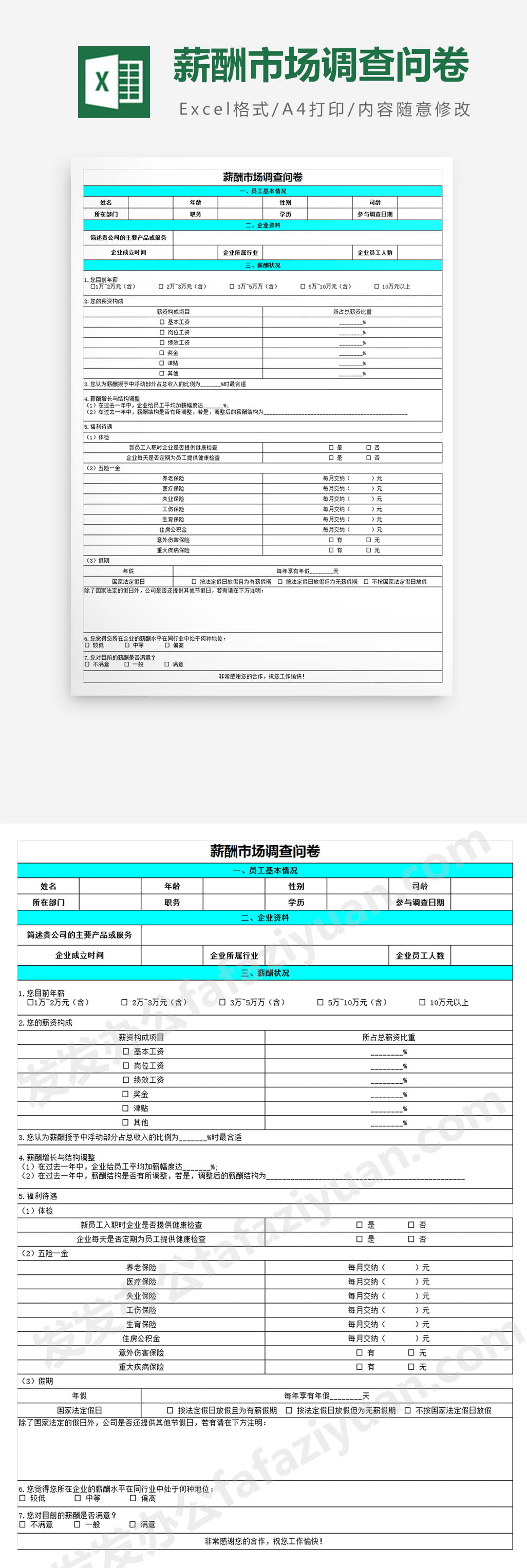 作品内容为薪酬市场调查问卷, 格式为 xlsx, 大小1MB,下载后可直接使用, 请使用软件Excel打开, 作品中主体文字及图片可替换修改,文字修改可直接点击文本框进行编辑,图片更改可选中图片后单击鼠标右键选择更换图片,也可根据自身需求增加和删除作品中的内容, 源文件无水印, 欢迎使用发发资源库。 资源下载此资源下载价格为8.8F币,VIP免费,请先登录