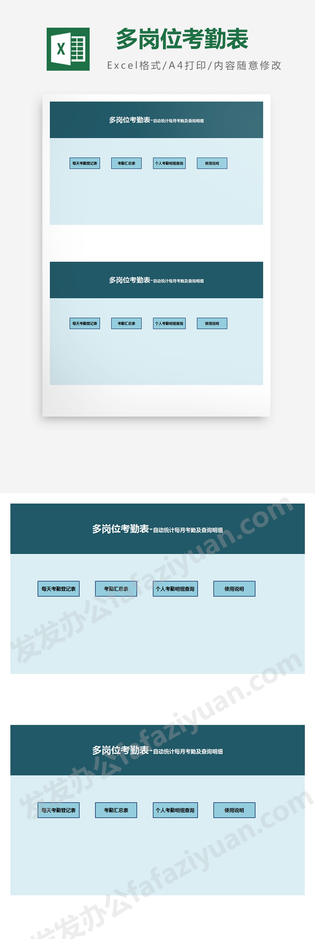 作品内容为多岗位考勤表-自动统计每月考勤及查询明细, 格式为 xlsx, 大小1MB,下载后可直接使用, 请使用软件Excel打开, 作品中主体文字及图片可替换修改,文字修改可直接点击文本框进行编辑,图片更改可选中图片后单击鼠标右键选择更换图片,也可根据自身需求增加和删除作品中的内容, 源文件无水印, 欢迎使用发发资源库。